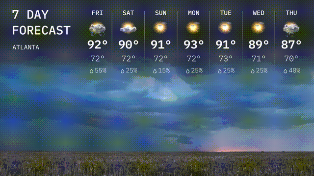Get ready for a rollercoaster of weather in Atlanta! Starting with sunny skies at 79°F and moving into stormy evenings with possible thunderstorms. Stay informed and prepared with our full forecast.