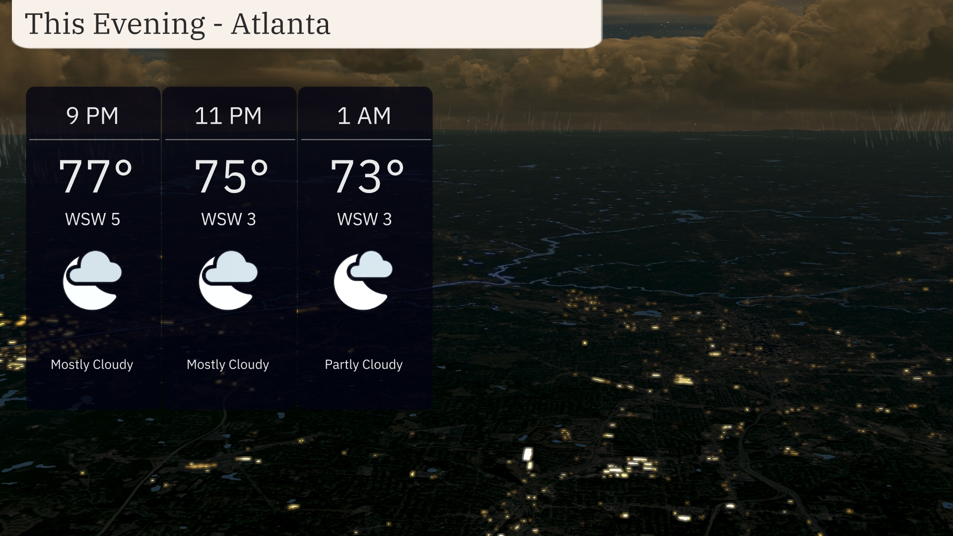 Evening in Atlanta brings mostly cloudy skies, with temperatures gently falling from 77 degrees at 9 PM to 73 degrees by 1 AM. Expect light winds from the west-southwest around 5 to 3 miles per hour through the night. A calm atmosphere prevails as clouds begin to thin out slightly towards early morning.