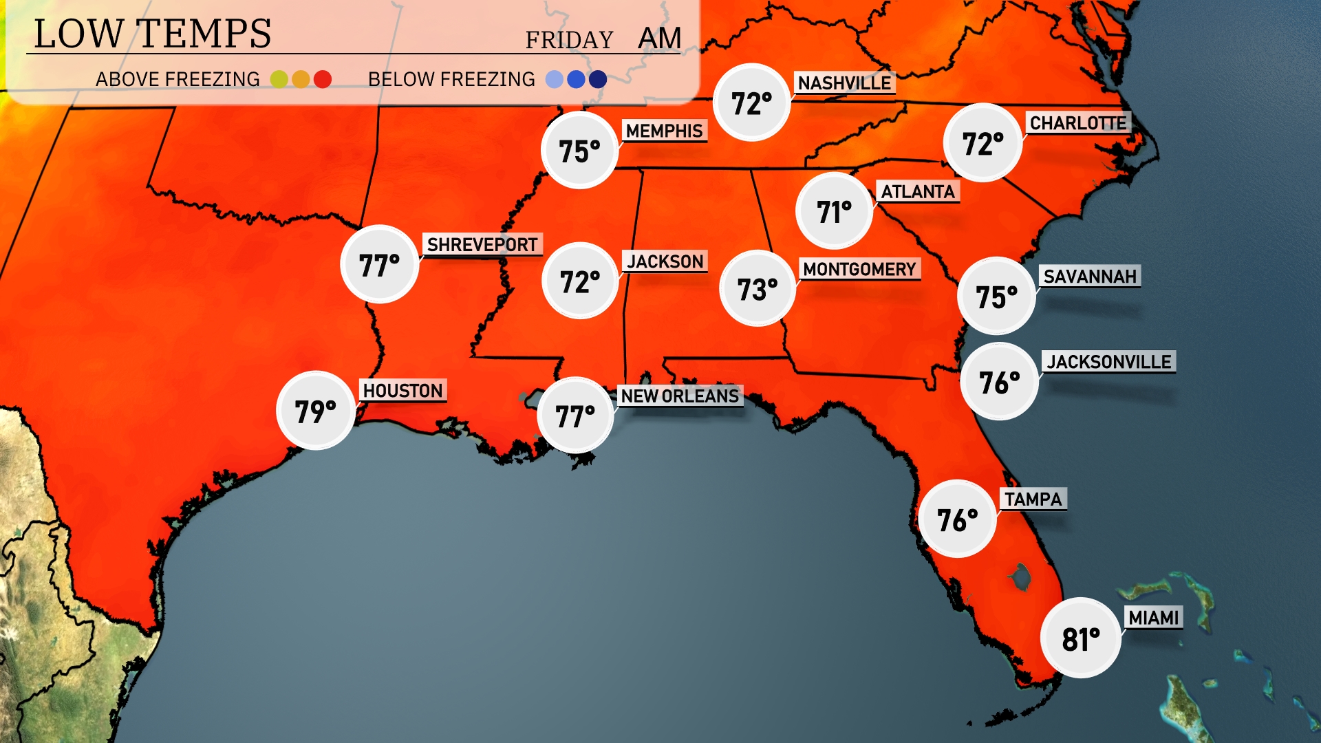 Tonight, Nashville will see a low of 72 degrees, while Memphis drops to 75. Shreveport is expecting a low of 77, and Jackson will cool to 72. Atlanta will experience a mild night with temperatures around 71, while Montgomery hits 73.