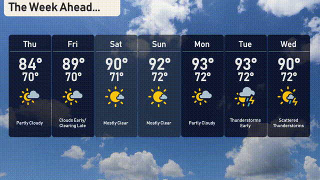 Thursday: Partly cloudy with a high of 84 degrees and a low of 70 degrees.