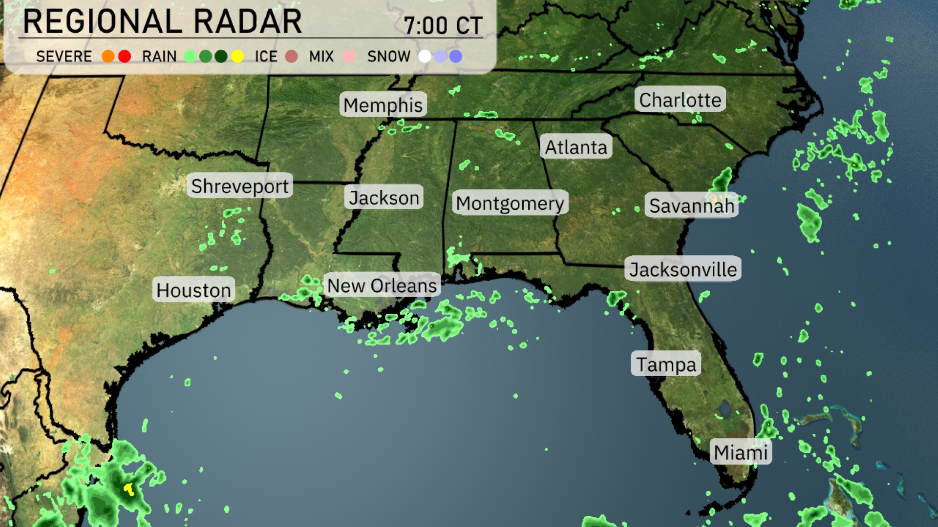 The regional radar shows isolated rain showers across the Gulf Coast from New Orleans to Houston, with light precipitation pushing toward the Florida panhandle and Jacksonville area. Today, the southeast enjoys mostly clear skies with only some scattered showers noted around Savannah and the coastal regions of South Carolina. Cloud cover is observed increasing as you move towards Atlanta, suggesting the potential for more rain. Meanwhile, cities like Charlotte and Memphis are currently experiencing calm conditions without rain.