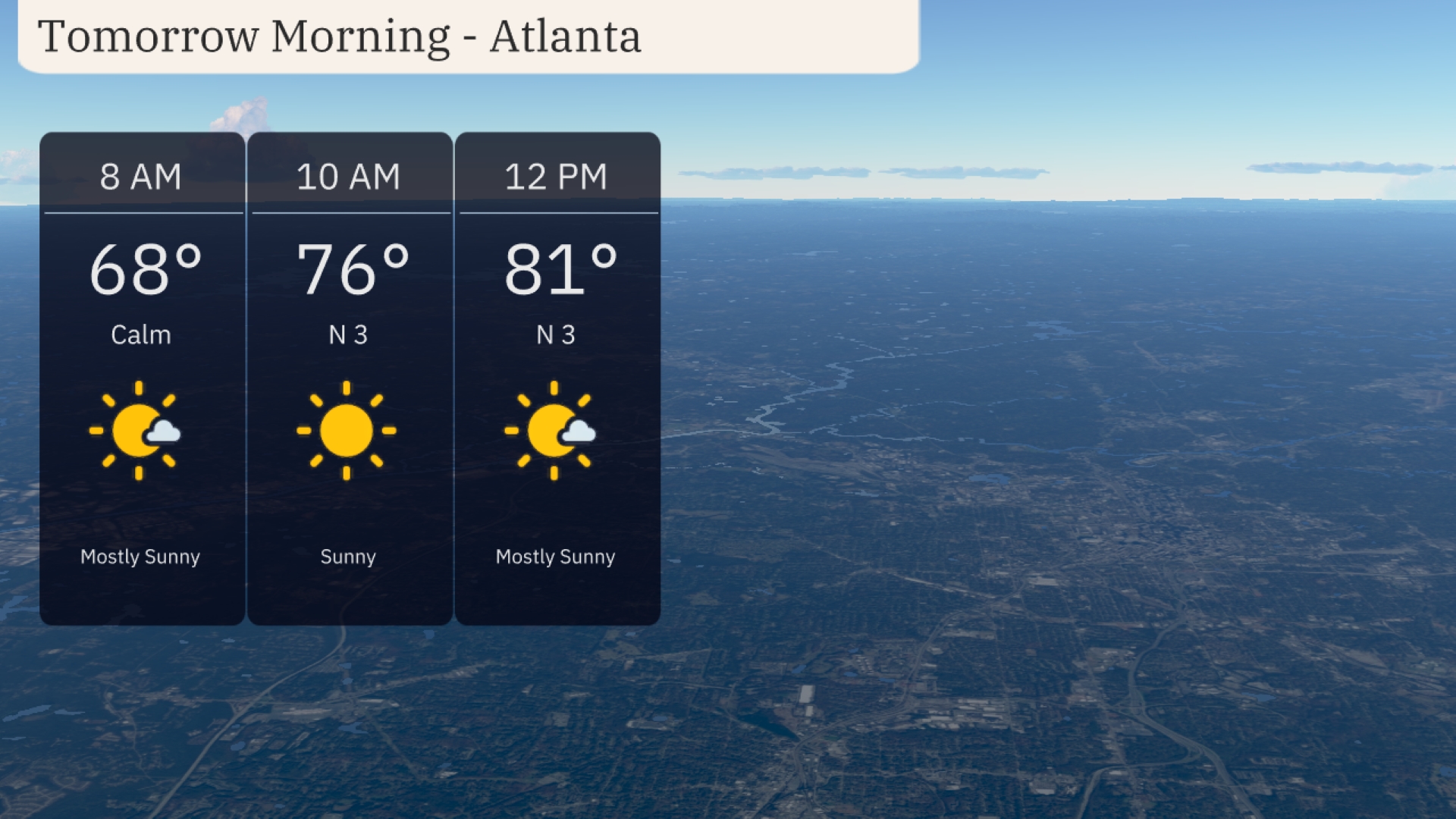 Tomorrow morning in Atlanta begins with mild and calm weather. At 8 AM, expect temperatures around 68 degrees with mostly sunny skies. By 10 AM, temperatures will rise to 76 degrees under clear, sunny conditions. Wind speed will remain calm at 3 mph, and temperatures will reach 81 degrees by noon with mostly sunny skies.