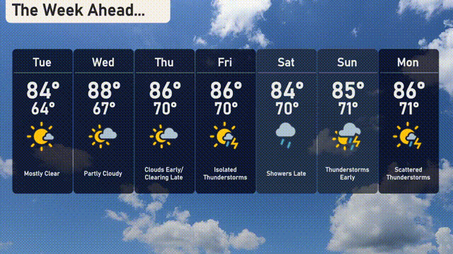 Wednesday: Partly cloudy as temperatures climb to 88 degrees, dipping to 67 degrees overnight.