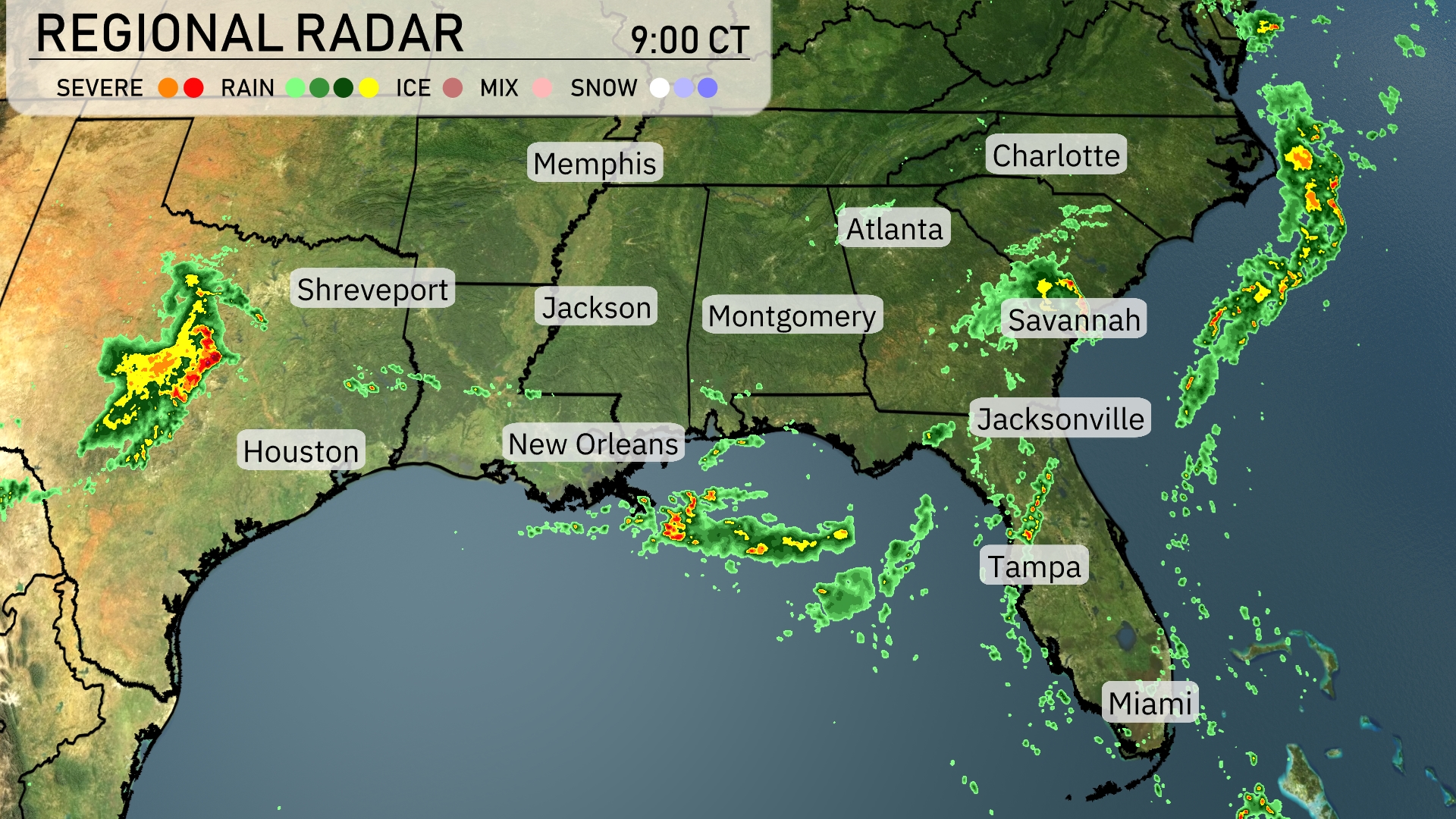 Storms are currently active near the Southeast, with severe weather near Houston extending eastward into Louisiana. Shreveport is under heavy rain, with the system moving towards Jackson and Montgomery. Rain bands trail the Gulf Coast from New Orleans to the Florida Panhandle, while cloud cover affects Tampa and Miami. Farther north, Charlotte and Atlanta remain clear under increasing clouds moving in from the west.