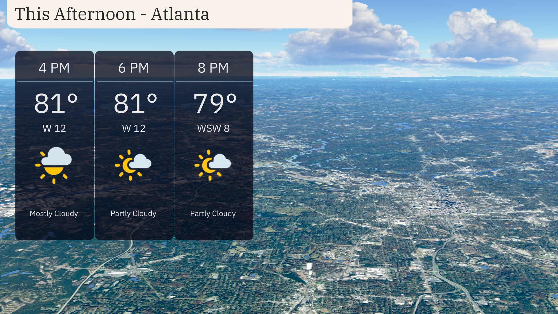 Throughout the afternoon in Atlanta, temperatures are consistent at 81 degrees, with a west-southwest wind at 12 miles per hour. Moving into the early evening, conditions remain warm with temperatures holding steady at 81 degrees, while the wind continues at 12 miles per hour. By 8 PM, the temperature slightly drops to 79 degrees, with a breeze shifting to 8 miles per hour from the west-southwest.
