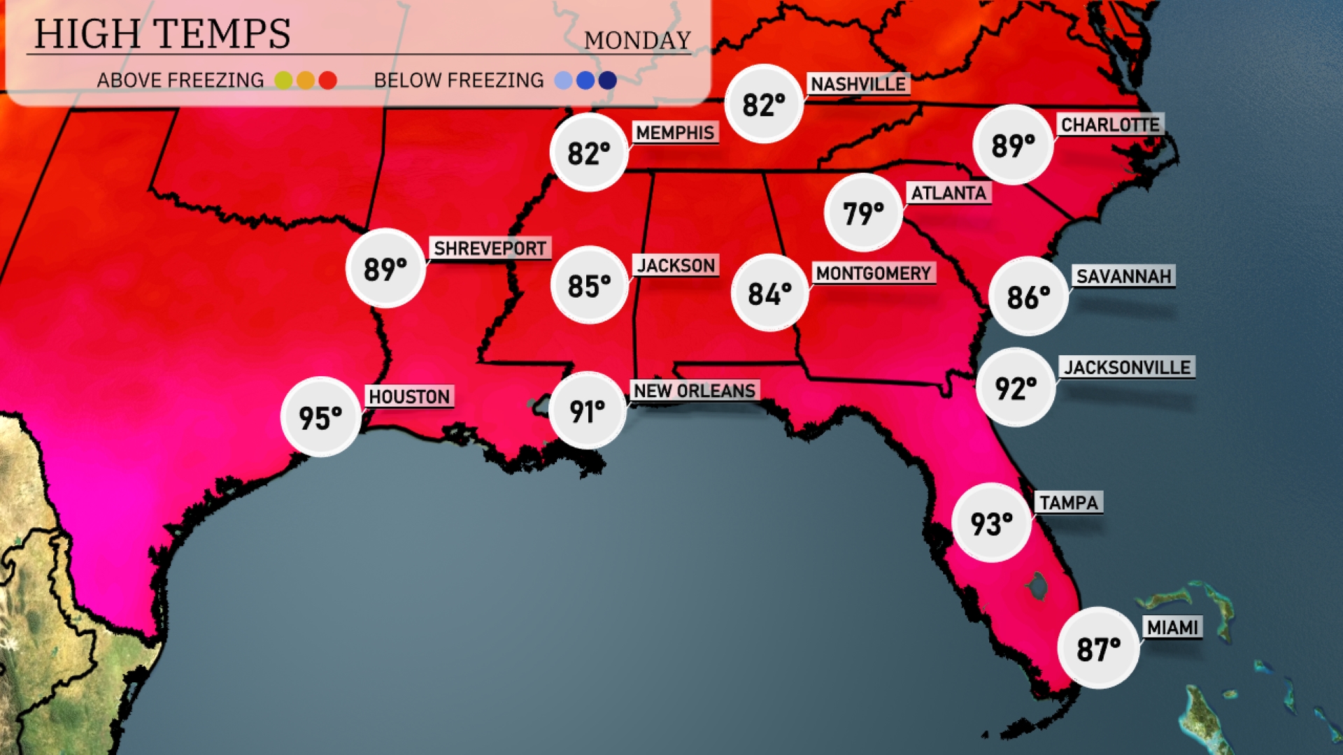 Tomorrow in Houston, expect a scorching high of 95 degrees, well above average for this time of year. New Orleans will also see elevated temperatures at 91 degrees, with plenty of humidity in the air. Meanwhile, Atlanta can anticipate a warm day with a high of 79 degrees. Further east, Jacksonville will heat up to 92 degrees, while Tampa reaches a sizzling 93 degrees.