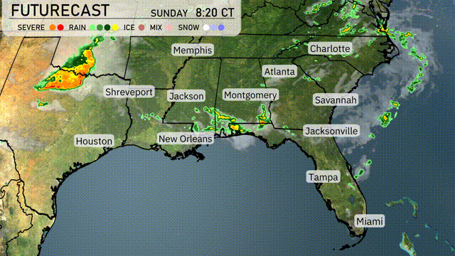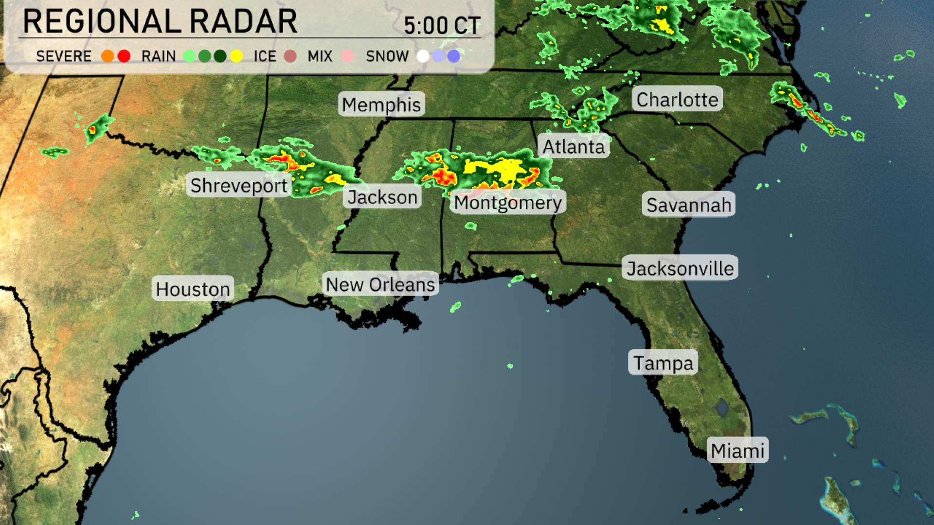 On the Regional Radar, a line of storms is sweeping from west to east, tracking from Shreveport, Louisiana towards Jackson, Mississippi. Memphis is experiencing moderate rainfall with potential thunderstorms moving southeast. Atlanta is currently under cloud cover with rain approaching from the west, promising a wet afternoon ahead. The coastal regions of the Carolinas, including Charlotte, are anticipating showers later as the weather system advances eastward.
