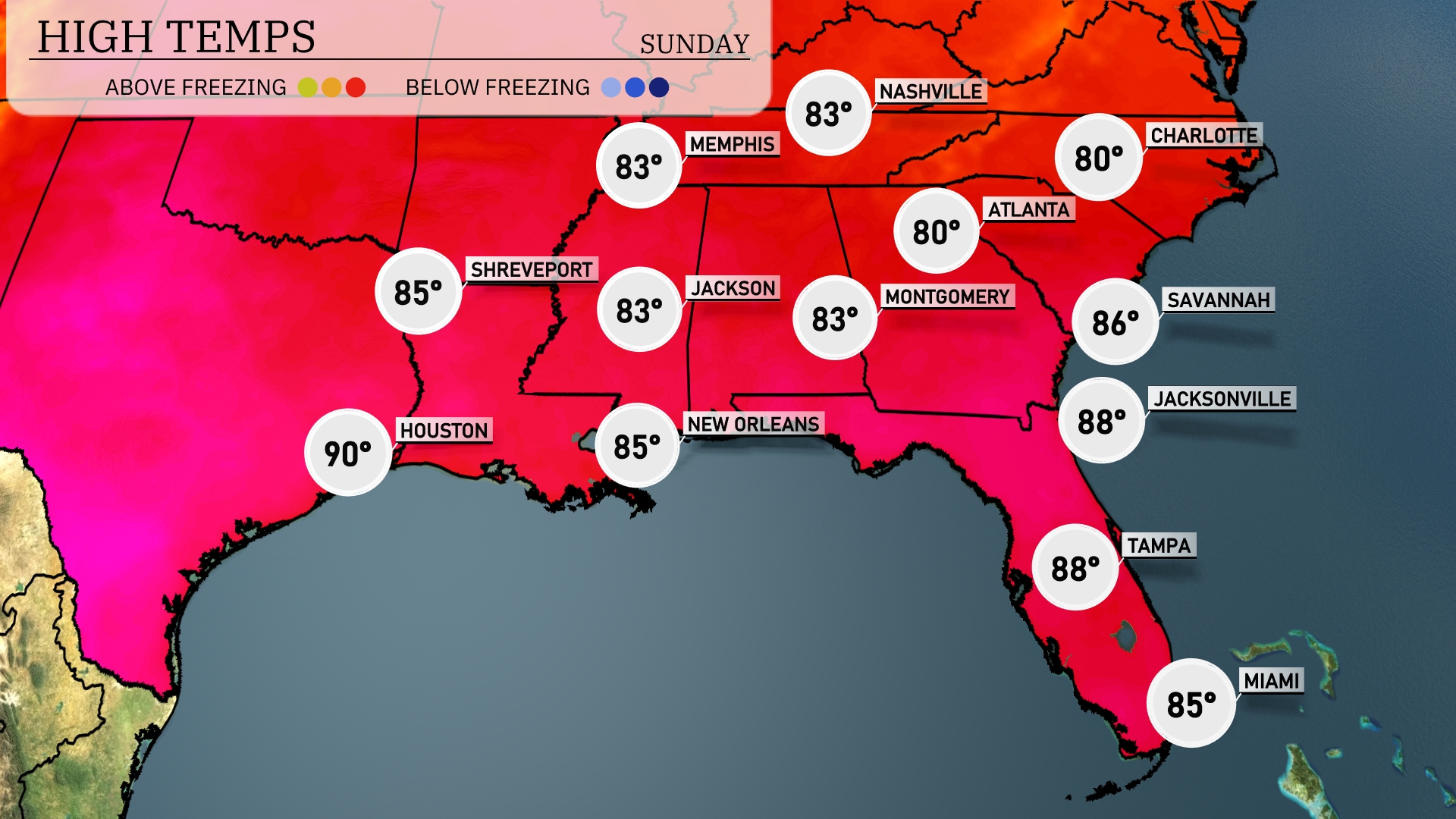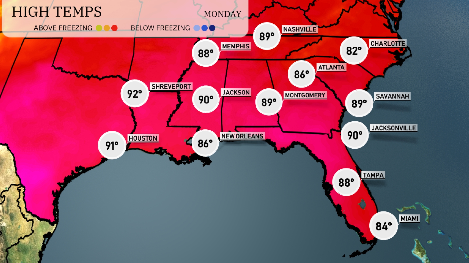 Tomorrow Atlanta will see a high of 86 degrees, while Jacksonville and Montgomery both expect highs of 90 degrees. Shreveport and Houston will be even warmer at 92 and 91 degrees, respectively. New Orleans will be slightly cooler at 86 degrees, but still well above normal for this time of year. Miami rounds out the region with a more temperate high of 84 degrees, keeping it mild compared to the rest of the Southeast.