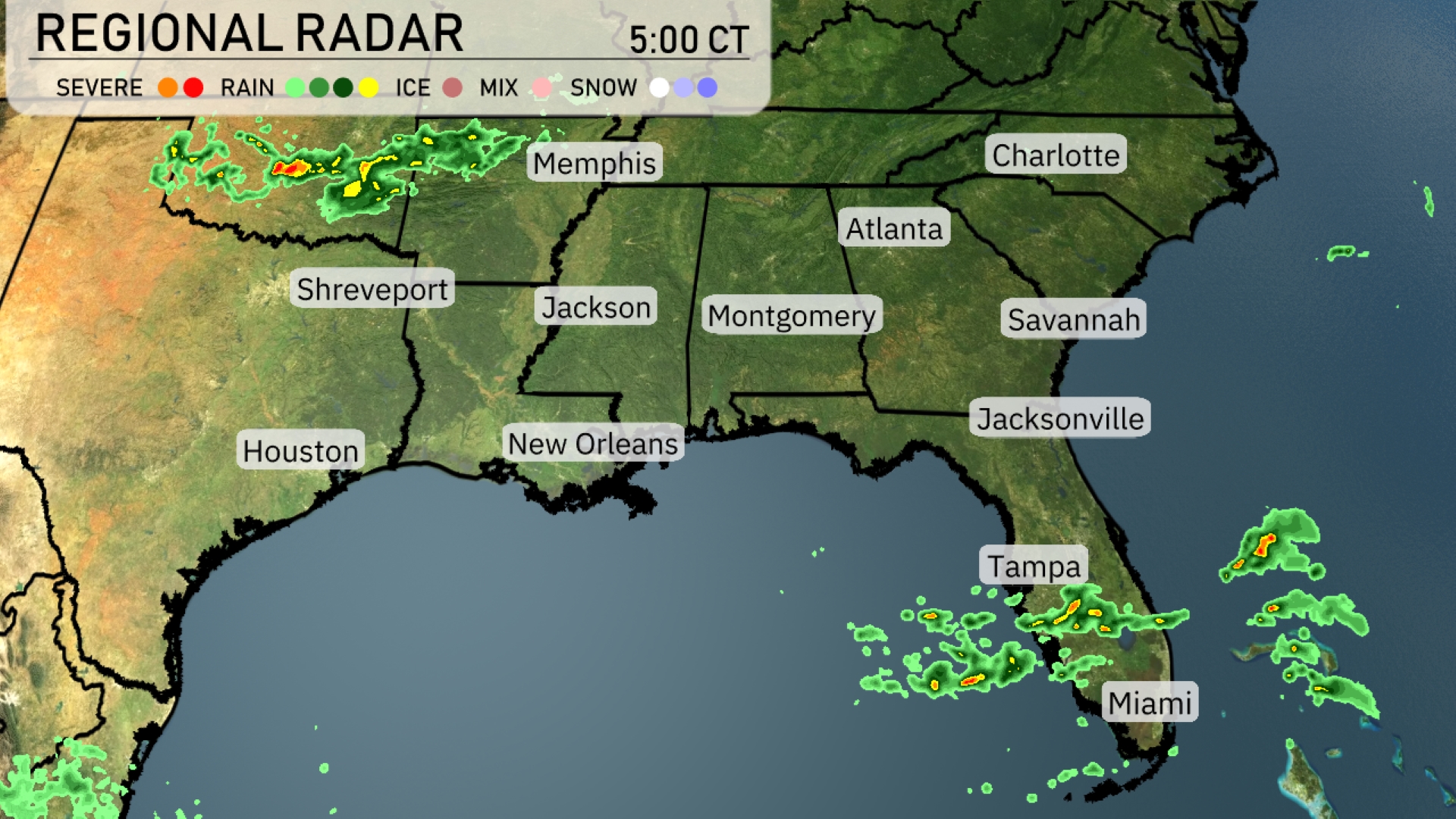 The Southeast radar shows active weather patterns with storms brewing along the Texas-Louisiana border. These severe storms are making their way toward Shreveport and Houston, bringing rain and potential thunderstorms. Rain showers are scattered across central Florida, with Miami and Tampa seeing some persistent activity. Meanwhile, the Gulf Coast from New Orleans to Jacksonville presents more isolated showers, but nothing too intense at the moment. Inland areas, including Montgomery and Atlanta, remain mostly clear with no significant cloud cover or precipitation.