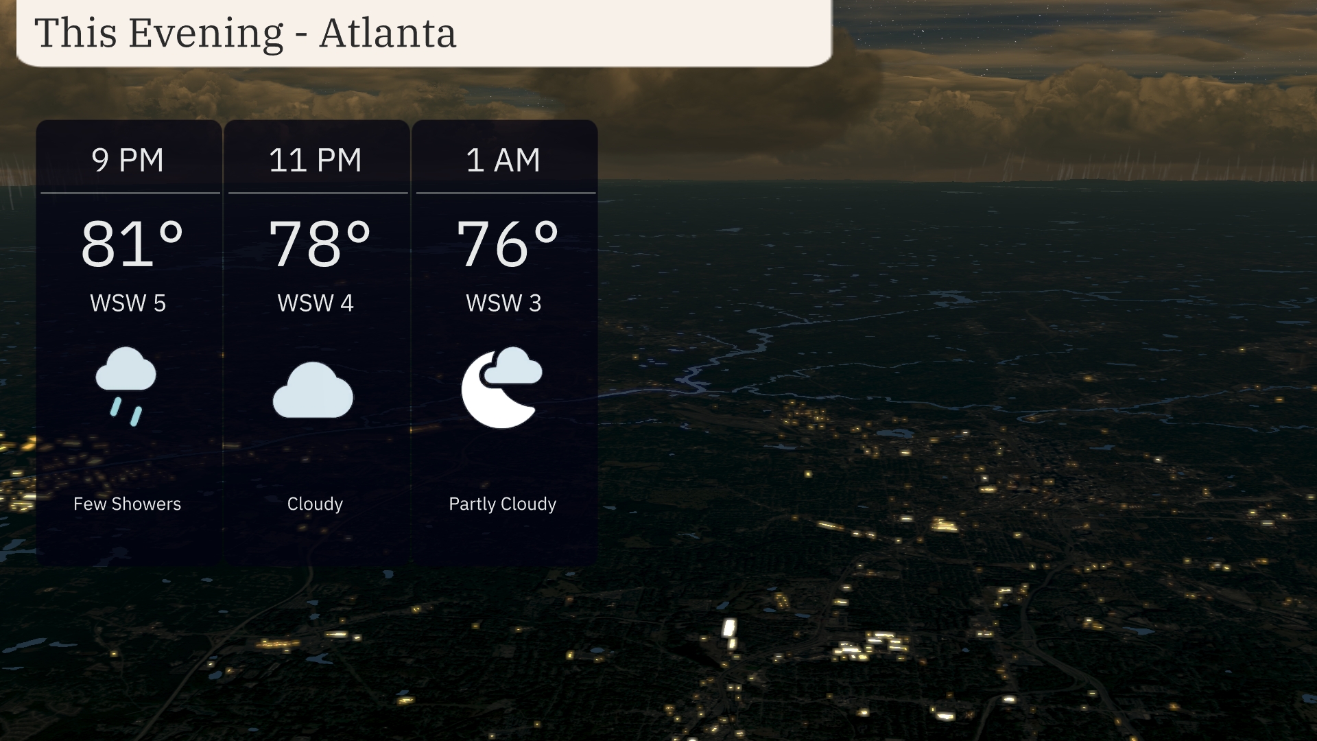 This evening in Atlanta, anticipate temperatures to gradually decrease from 81 degrees at 9 PM to 76 degrees by 1 AM. A few showers are likely early on, diminishing to partly cloudy skies by late evening. Winds will shift from west-southwest at 5 miles per hour to a slightly calmer 3 miles per hour.
