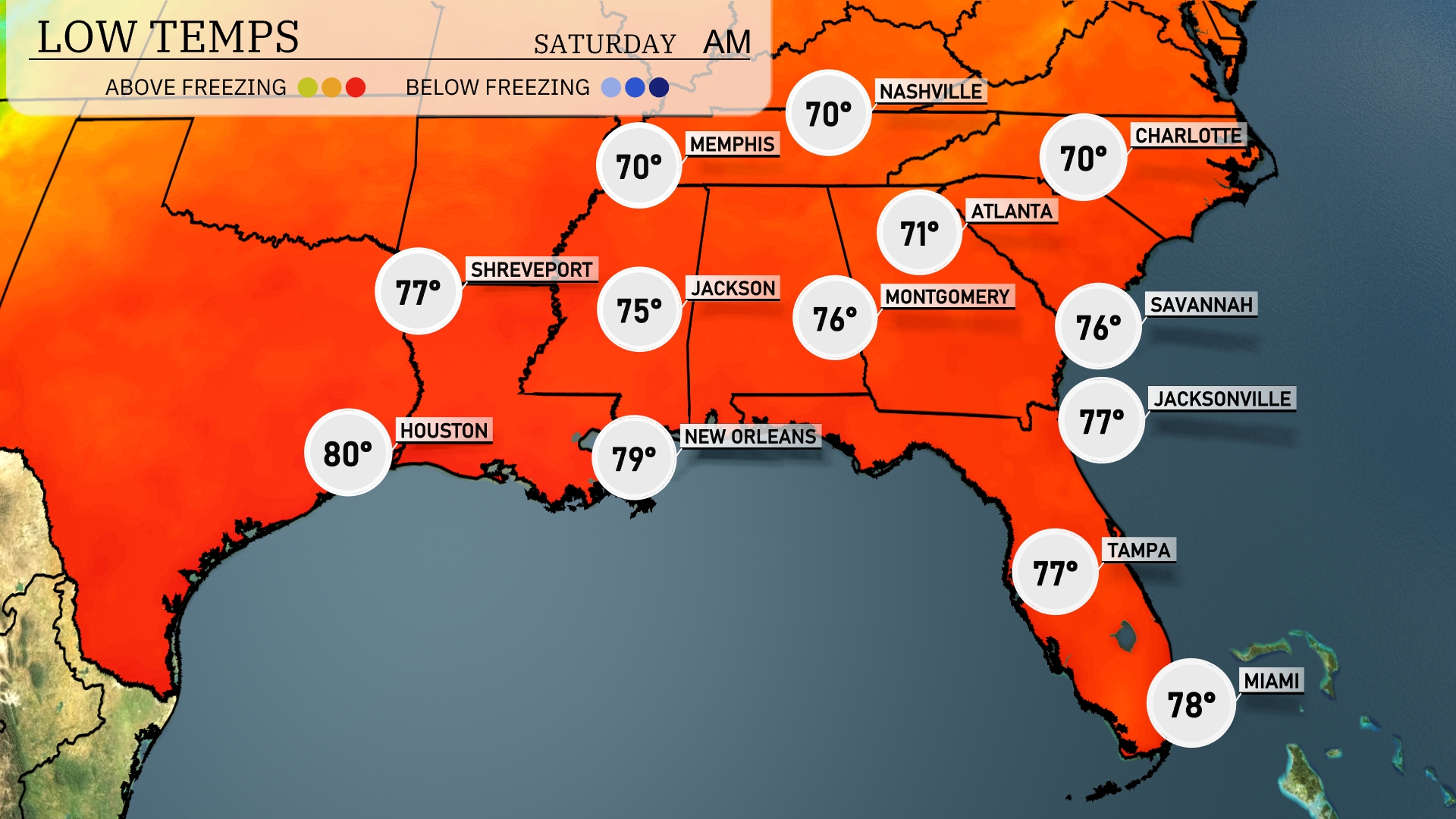 Tonight, lows will drop to 70 degrees in Memphis and 71 degrees in Nashville, signaling a slight cool down. Shreveport will see a low of 77 degrees, while Jackson will rest at 75 degrees. Montgomery is expected to cool to 76 degrees, and further south in New Orleans, temperatures will settle around 79 degrees.