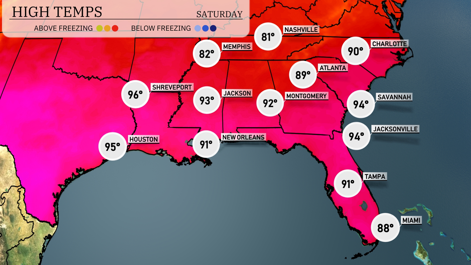 Tomorrow in Houston, expect a high of 95 degrees, while Shreveport tops out at a scorching 96. Jackson will see a warm 93 degrees, and New Orleans will warm up to 91. Atlanta is set for a high of 89, with Montgomery close behind at 92. In Florida, temperatures soar to 94 in both Jacksonville and Savannah, while Tampa reaches 91 degrees.