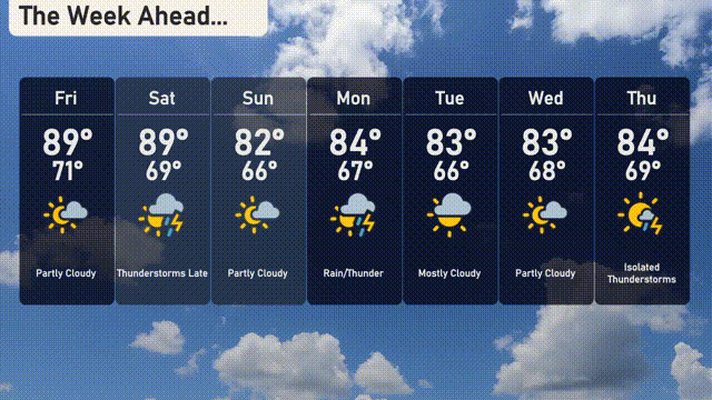 For the 7 Day Outlook in Atlanta: Friday: Expect partly cloudy skies with a high of 89 degrees and a low of 71 degrees. Saturday: Thunderstorms are anticipated later, with temperatures reaching 89 degrees and dipping to 69 degrees overnight. Sunday: Partly cloudy conditions with a daytime high of 82 degrees and a low of 66 degrees. Monday: Look out for rain and possible thunderstorms with a high of 84 degrees and a low of 67 degrees. Tuesday: Mostly cloudy skies, the high will be 83 degrees, cooling to 66 degrees at night. Wednesday: Partly cloudy weather continues with a high of 83 degrees and a low of 68 degrees. Thursday: Isolated thunderstorms are possible, reaching up to 84 degrees during the day and 69 degrees overnight.