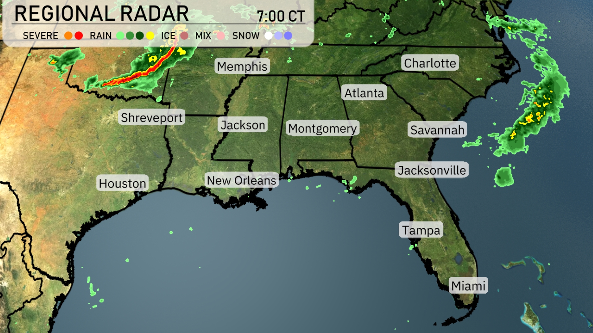 A strong line of severe storms is currently making its way through eastern Texas into western Louisiana, with Shreveport experiencing significant activity. Rain showers stretch from Jackson, Mississippi moving northeast, progressively affecting areas like Montgomery and Atlanta. Clear conditions prevail in major cities like Miami, Tampa, and Jacksonville. Cloud cover is more prominent over the Carolinas, with precipitation developing off the coast near Wilmington and heading towards Charlotte.