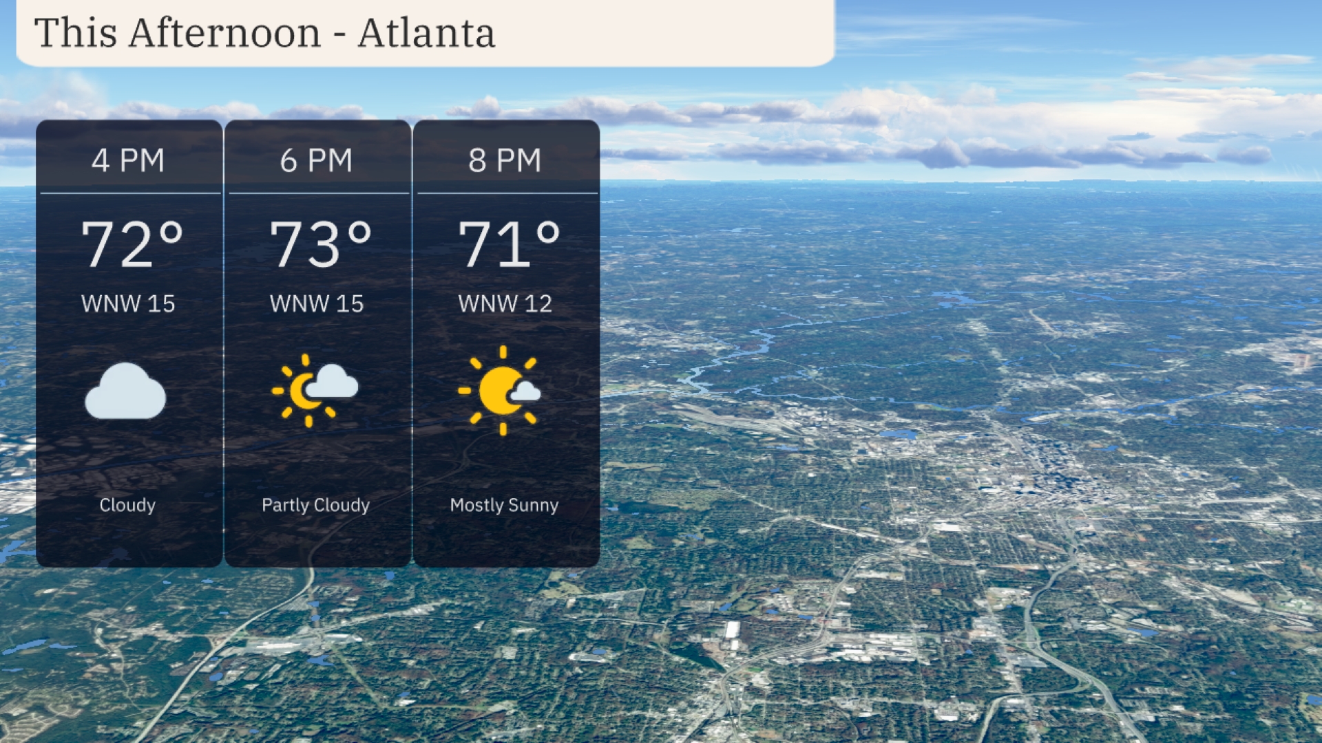 Afternoon in Atlanta features mild temperatures, peaking at 73 degrees by 6 PM. Winds are westerly at 15 miles per hour, offering a gentle breeze. Cloud cover will lessen as the afternoon progresses, moving from cloudy to mostly sunny by 8 PM.
