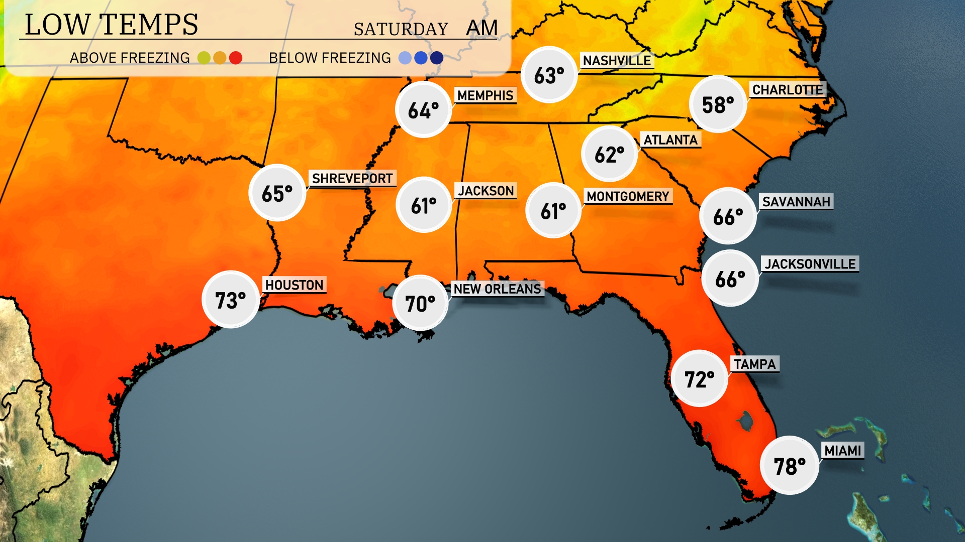 Tonight in the Southeast, we’re looking at some notably cool temperatures as the cold air settles in. Expect 61 degrees in Jackson, which may feel a bit brisk. Atlanta is forecasted to drop to 62, while Nashville will see a low of 63. The coastal areas are also feeling the chill, with Savannah at 66 and Jacksonville at the same. Miami stays mild at 78 degrees, but it’s significantly cooler than usual for the region.