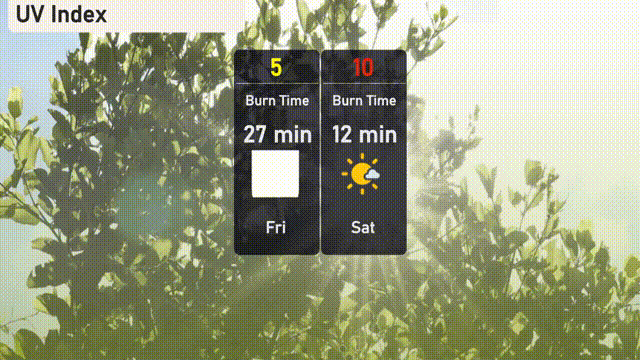 The UV index in Atlanta will reach a 5 on Friday, indicating a moderate sun strength with a burn time of about 27 minutes. By Saturday, the UV index escalates to 10, which is very high, reducing the burn time to just 12 minutes in direct sunlight.