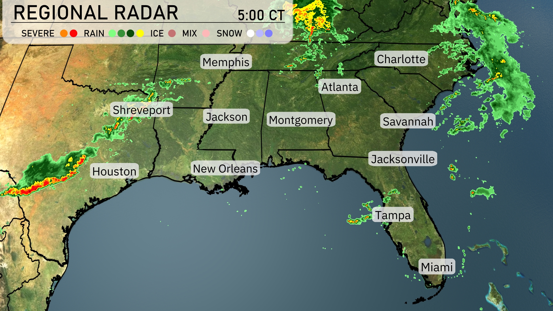 The Southeast region is currently experiencing scattered rain showers with the radar showing active weather patterns. In Texas, a line of strong storms is approaching Houston from the west, while Shreveport is already experiencing rain. Jackson is receiving lighter showers that are expected to drift towards Montgomery. The Carolinas, including Charlotte, are seeing increased precipitation and cloud cover as rain moves in from the northeast. Coastal cities like Miami and Tampa remain relatively dry, enjoying clear skies for now.