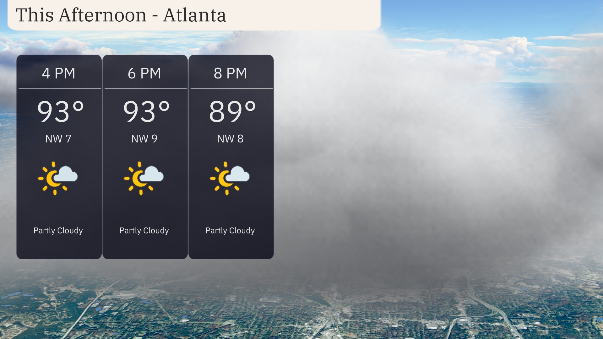 This afternoon in Atlanta, temperatures will reach up to 93 degrees with partly cloudy skies. Expect northwesterly winds around 7 to 9 miles per hour, providing a gentle breeze amid the warm weather. By 8 PM, temperatures will ease into the upper 80s, continuing the partly cloudy trend.