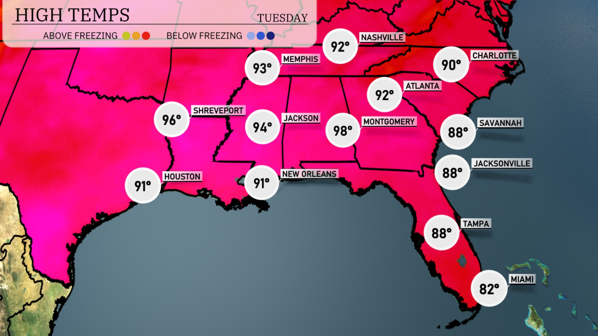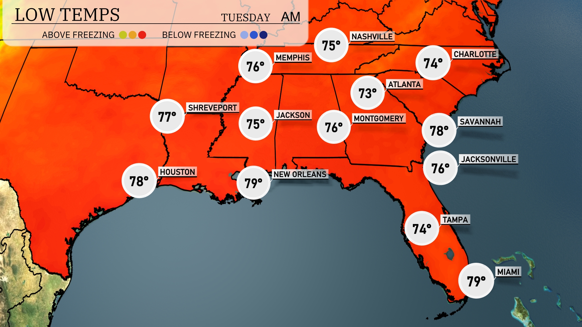 Tonight, Memphis will cool down to 75 degrees. Nashville will experience a low of 73 degrees. Expect cooler air in Jackson, dipping to 75 degrees, while Montgomery will see a low of 76. In the coastal areas, Tampa will settle at 74 degrees, with Miami remaining mild at 79 degrees.