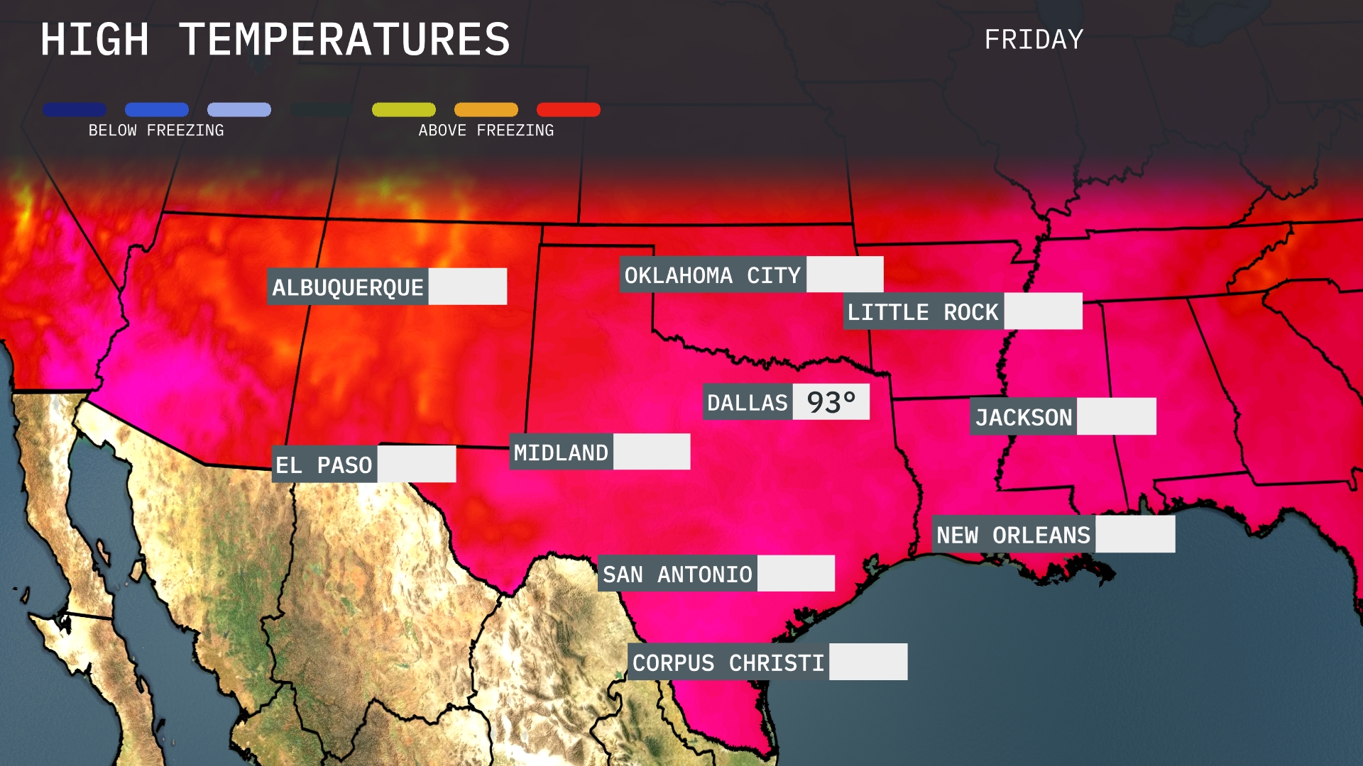 Tomorrow in Dallas, expect a scorching high of 93 degrees, significantly above average for this time of year. Midland will reach a warm 89 degrees, while El Paso is slightly cooler at 84 degrees. In San Antonio, temperatures will peak at a comfortable 81 degrees. Corpus Christi is set for a high of 82 degrees.