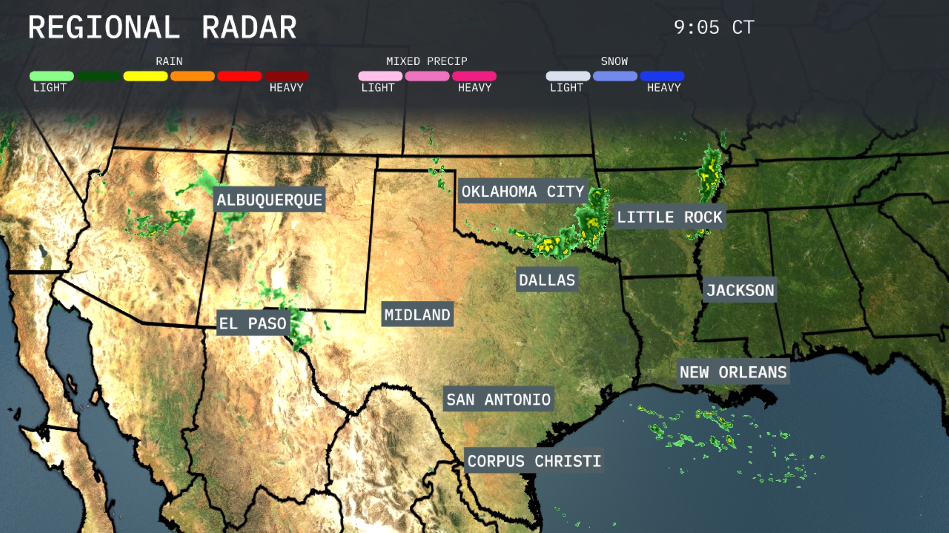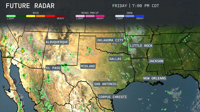 A line of heavy storms is passing through Oklahoma City, advancing towards Little Rock. New Orleans is experiencing scattered rain showers moving through the region. Albuquerque is seeing some light rain scattered across the area, bringing relief. El Paso is staying dry, with some rain approaching from nearby regions.