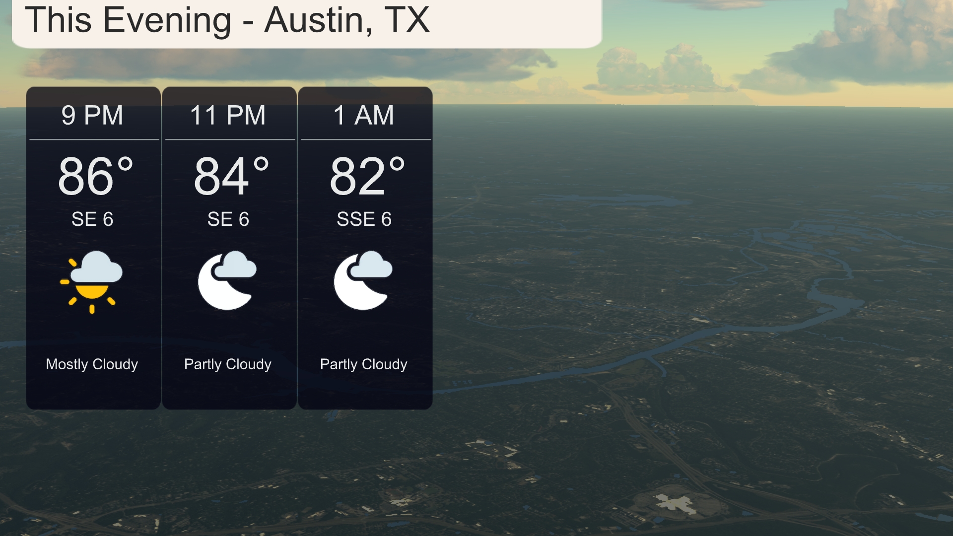 This evening in Austin, temperatures begin at 86 degrees at 9 PM, gradually cooling to 82 degrees by 1 AM. Winds will maintain a southeast direction at about 6 miles per hour. The cloud cover will start as mostly cloudy, shifting to partly cloudy as we move through the late evening. Overall, it should be a calm and pleasant night ahead.
