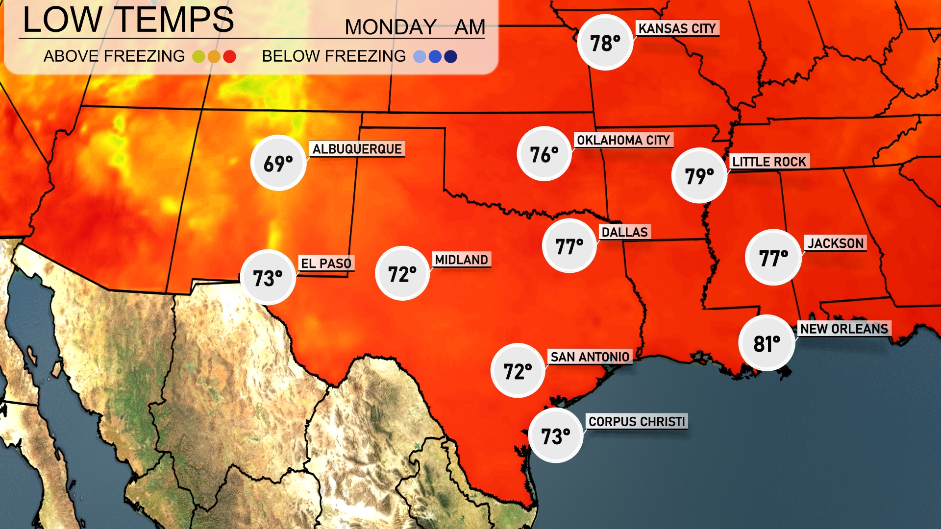 Tonight in the Southern Plains, temperatures will dip significantly, with Dallas reaching a low of 77 degrees. Oklahoma City is expected to see a nighttime low of 76, while Midland will drop to 72 degrees. San Antonio and El Paso will remain warmer, both settling at 72. Meanwhile, Little Rock will cool down to 79 degrees.