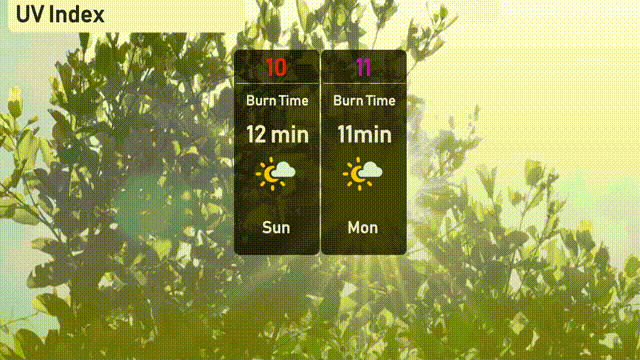 The UV index in Austin will be extreme at 10 on Sunday, with a burn time of just 12 minutes in direct sunlight. On Monday, it reaches an even higher level of 11, reducing the burn time to a rapid 11 minutes! Make sure to use strong sunscreen and take extra precautions against prolonged sun exposure.