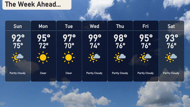 Sunday: Partly cloudy with a high of 92 degrees and a low of 75 degrees.