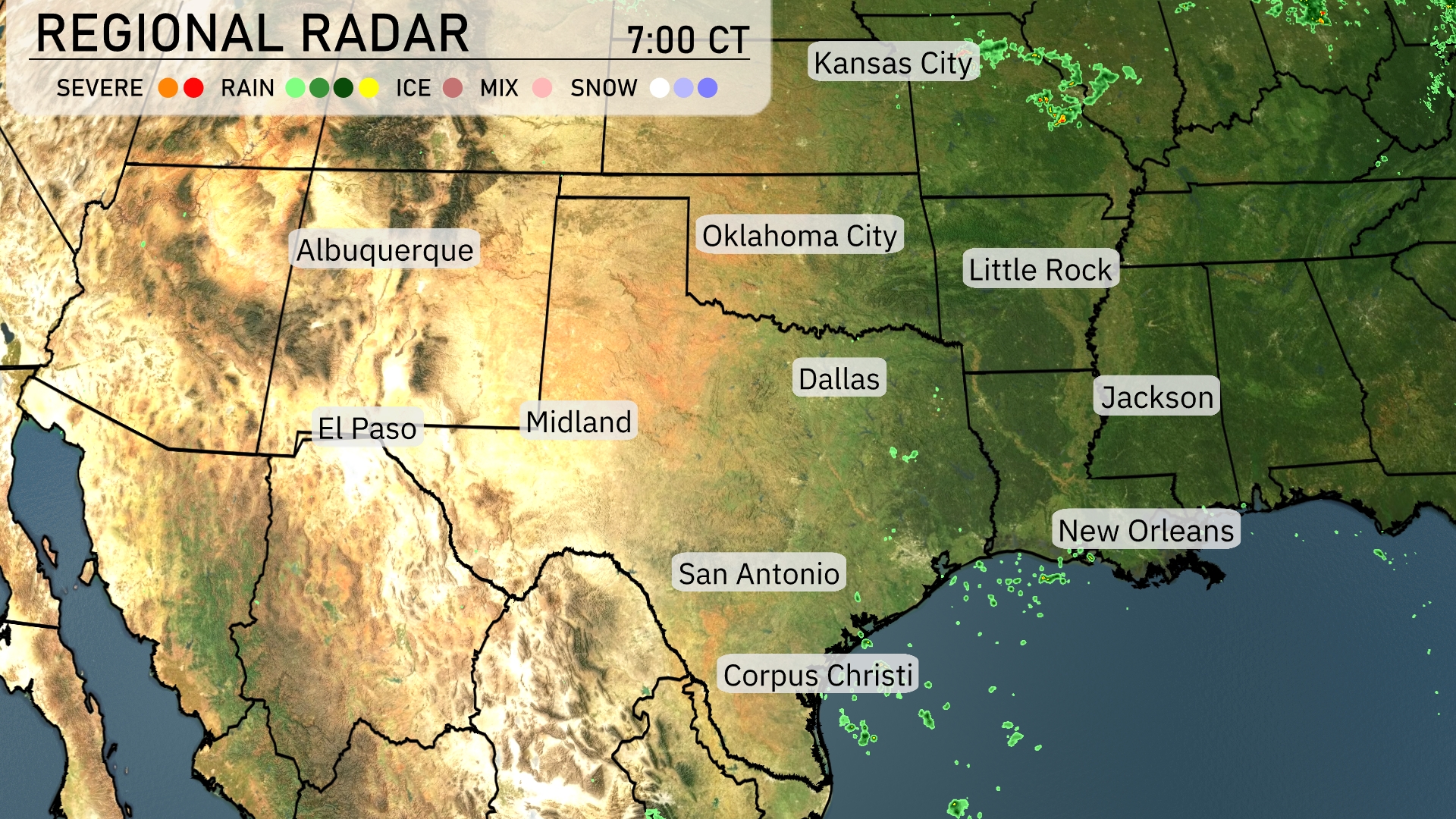 The Southern Plains are experiencing a tranquil morning with plenty of sunshine across most areas, providing a gentle start to the day. A few isolated showers are popping up near Dallas and Corpus Christi, though they are sparse at the moment. As we look towards Kansas City, there’s a hint of some cloud cover building up, but it’s staying dry for now. Texas cities like El Paso and San Antonio are basking in clear skies, making it ideal for outdoor plans.