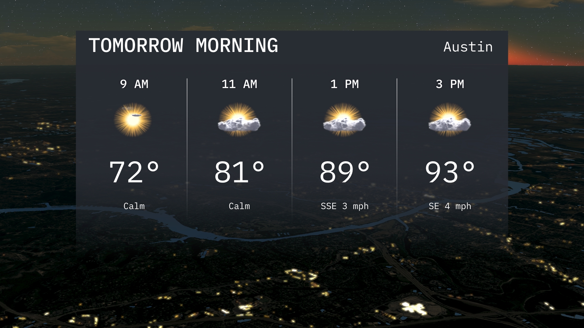 Temperatures in Austin start at a comfortable 72 degrees at 9 AM, climbing to 81 degrees by 11 AM. The morning will be mostly sunny with calm winds, providing a pleasant start to the day. As temperatures rise, conditions remain calm until the early afternoon.