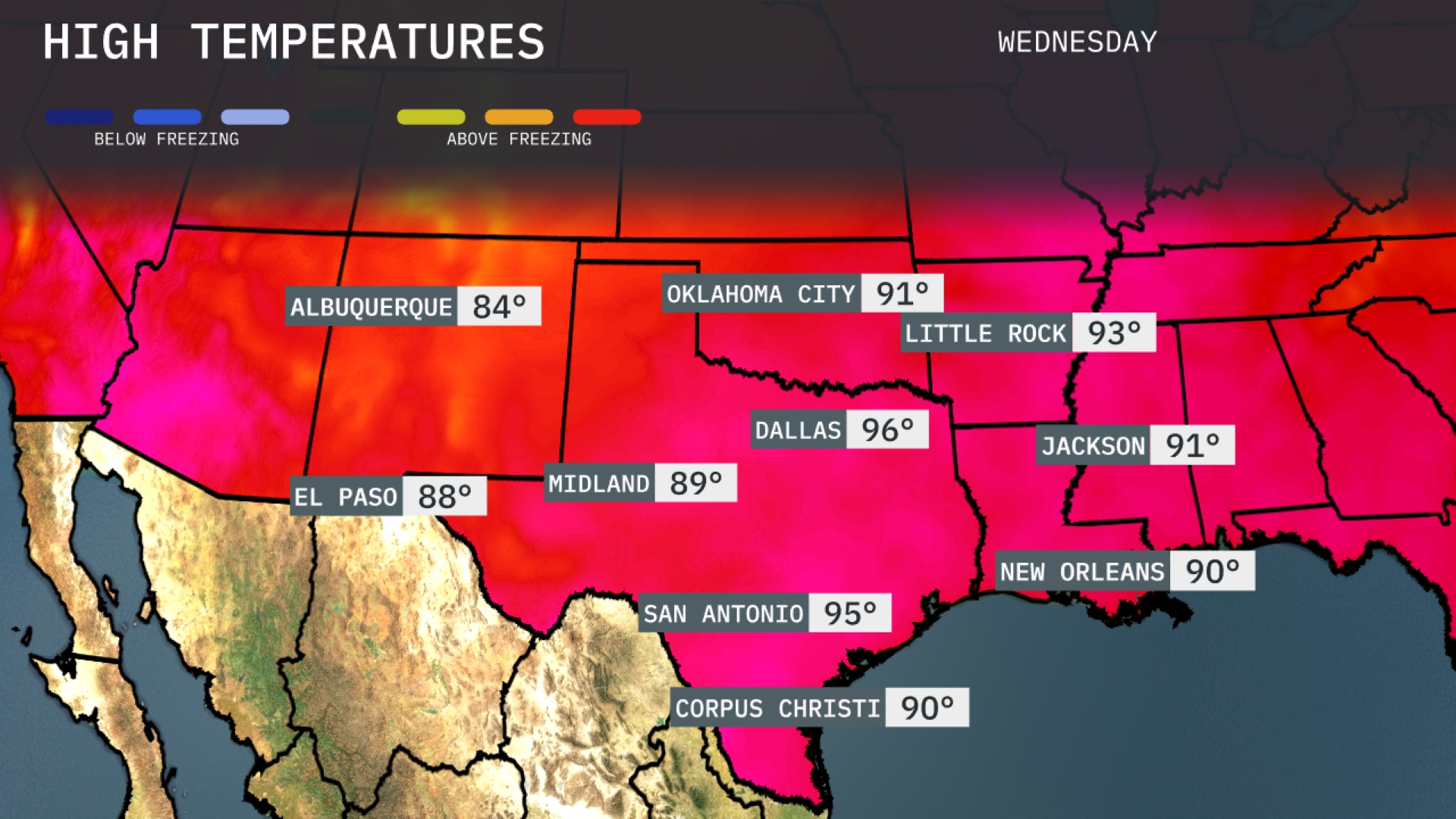 Tomorrow, Dallas will see a sizzling high of 96 degrees. San Antonio is also heating up, reaching 95 degrees, while Midland follows closely at 89 degrees. Oklahoma City is forecasted to hit 91 degrees, with Little Rock not far behind at 93 degrees. Temperatures are well above average for this time of year in the Southern Plains, driven by a strong ridge of high pressure lingering in the region.