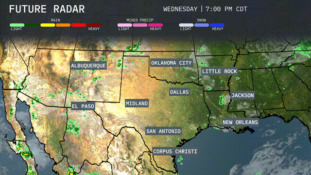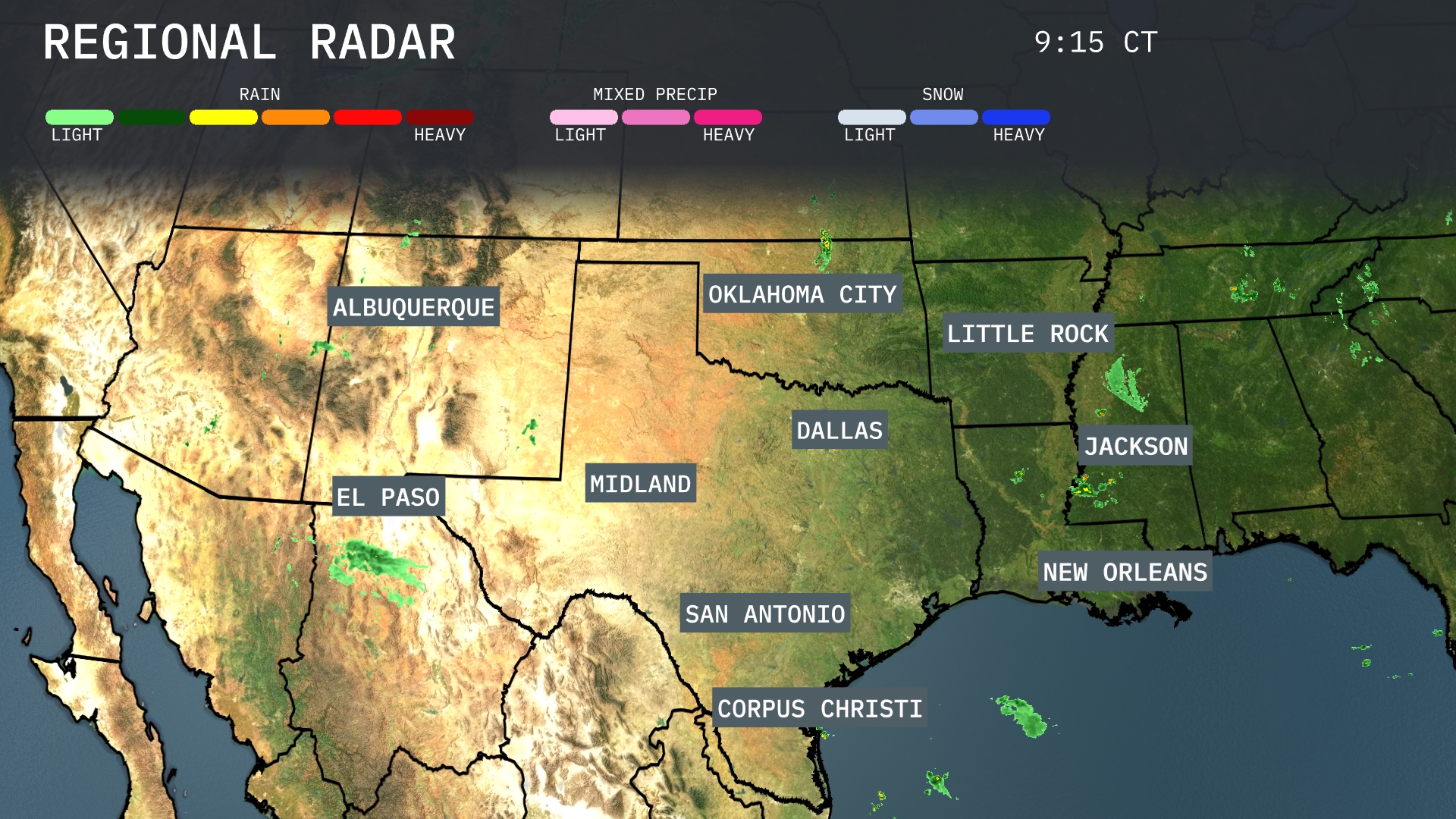Showers are light but moving through the area south of El Paso, with a few scattered storms around Albuquerque. Near Midland, some light precipitation is present, while Dallas and Oklahoma City remain dry under clear skies. New Orleans and Corpus Christi are experiencing heavier showers, with rain clouds advancing towards Little Rock. Conditions around Jackson are notably wet, as showers maintain their grip on the region.