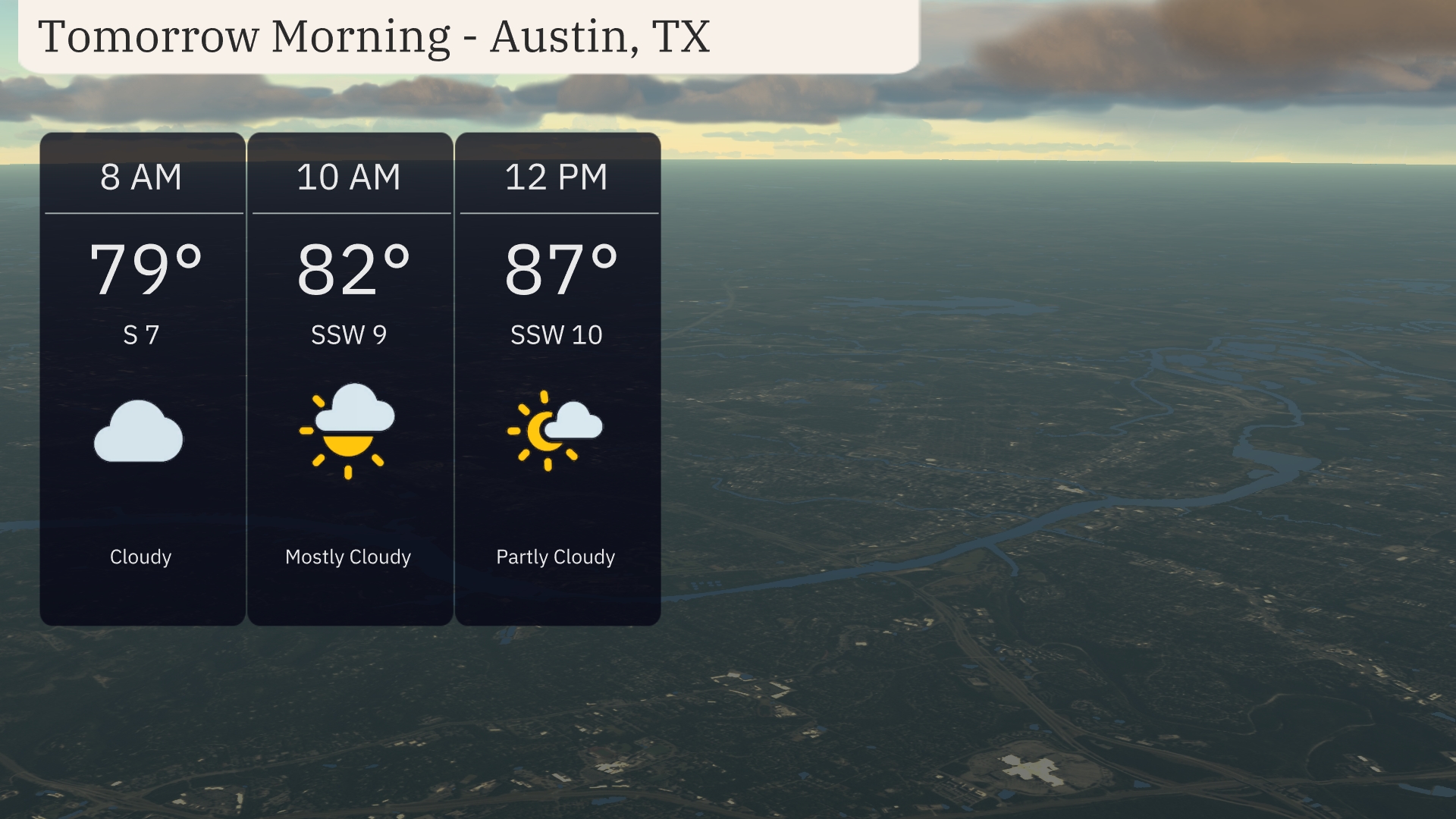 Start your Friday in Austin with temperatures around 79 degrees at 8 AM, rising to 82 degrees by 10 AM. Expect a mostly cloudy morning with winds shifting from the south at 7 mph to the south-southwest at 9 mph. By midday, clouds begin to clear, leading to partly cloudy conditions with a temperature nearing 87 degrees, and winds increasing slightly to 10 mph from the south-southwest.