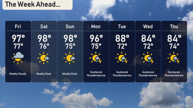 Friday: Mostly cloudy with a high of 97 degrees and a low of 77 degrees.