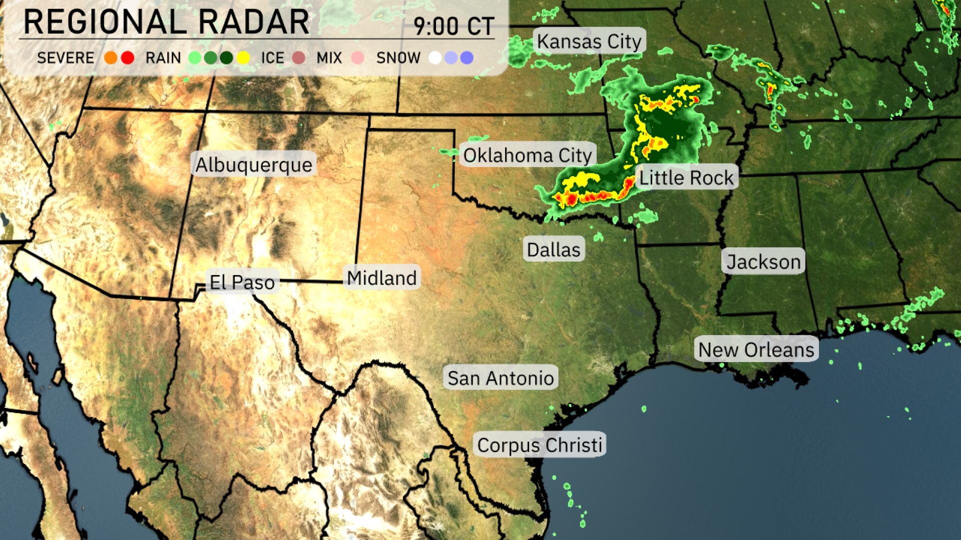 On the Regional Radar, a batch of storms is located over northeastern Oklahoma and is tracking towards Little Rock, Arkansas, bringing considerable rainfall and some severe weather elements. For areas like Kansas City, the skies remain largely clear, while Oklahoma City, which recently saw storms, is now experiencing lighter showers. Southern parts of this wide region, including Dallas and San Antonio, remain dry under partly cloudy conditions. Areas west towards Albuquerque and El Paso are enjoying clear skies today.