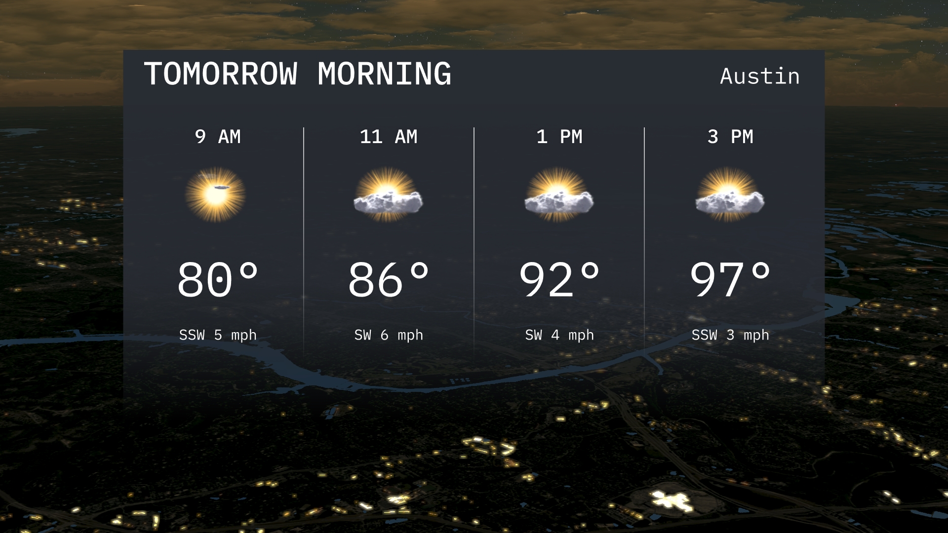For tomorrow morning in Austin, expect temperatures to rise from 80 degrees at 9 AM to a warm 86 degrees by 11 AM. There will be partly sunny skies with a gentle breeze, predominantly from the south-southwest.