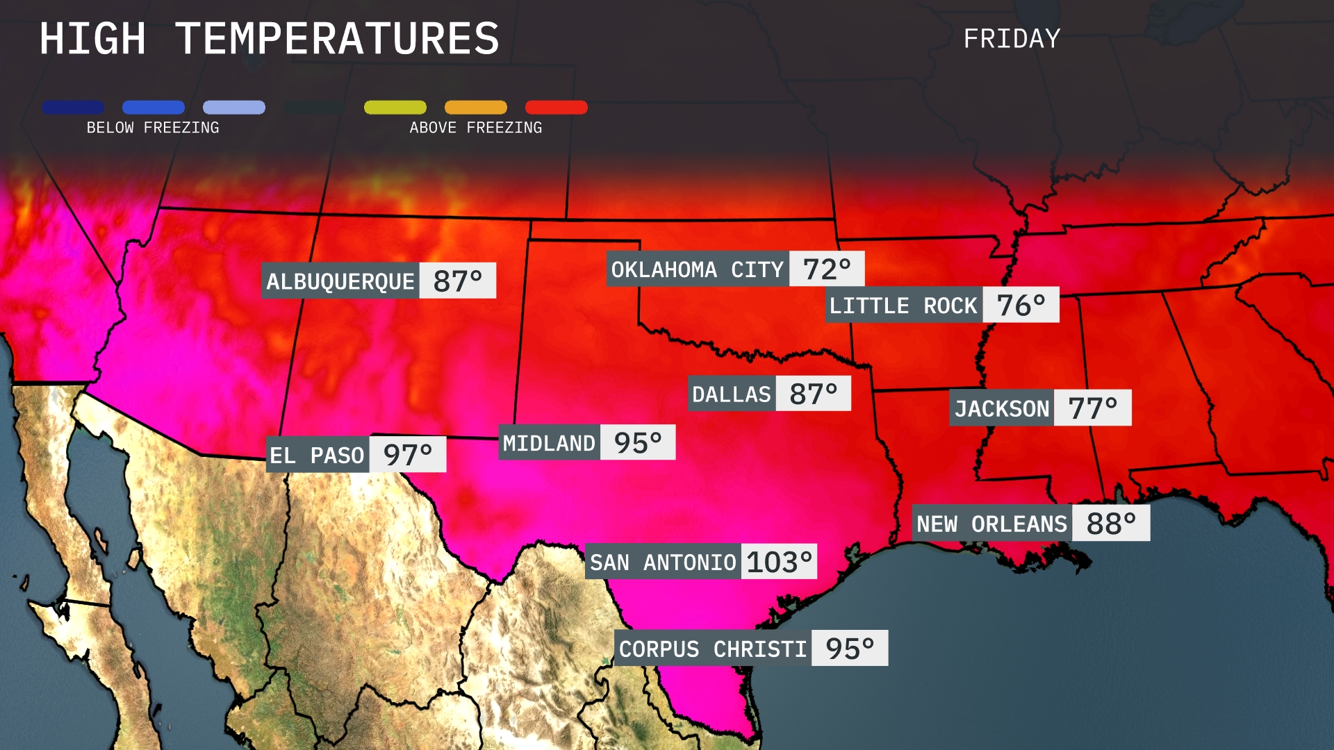 Tomorrow in El Paso, we can expect a sweltering high of 97 degrees. Midland will experience a warm day with temperatures climbing to 95 degrees, while Dallas also reaches a notable 87 degrees. San Antonio is looking at a significant spike, hitting 103 degrees, which is well above average for this time of year. Meanwhile, Oklahoma City will see cooler conditions with a high of just 72 degrees, presenting a stark contrast to the southern areas. In Little Rock, temperatures will be moderate, peaking at 76 degrees.