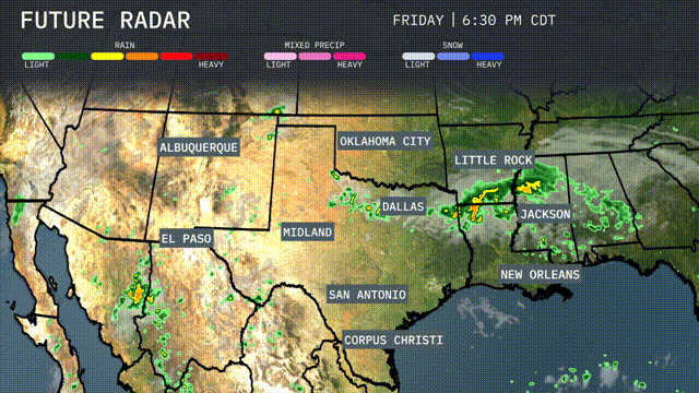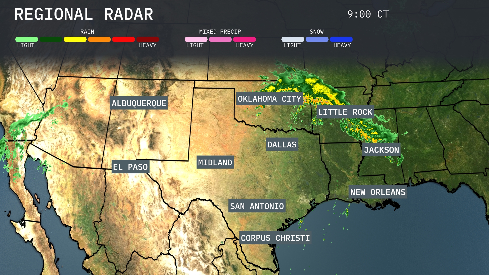 A line of heavy rain is stretching from Oklahoma City to Little Rock, bringing significant precipitation to these areas. In Jackson, storms are moving through rapidly, with heavy rain expected to continue. Clear skies persist around Dallas and San Antonio, providing a break from the wet conditions elsewhere. A system near the border between southern Colorado and New Mexico is spreading showers into El Paso, while Corpus Christi stays dry.