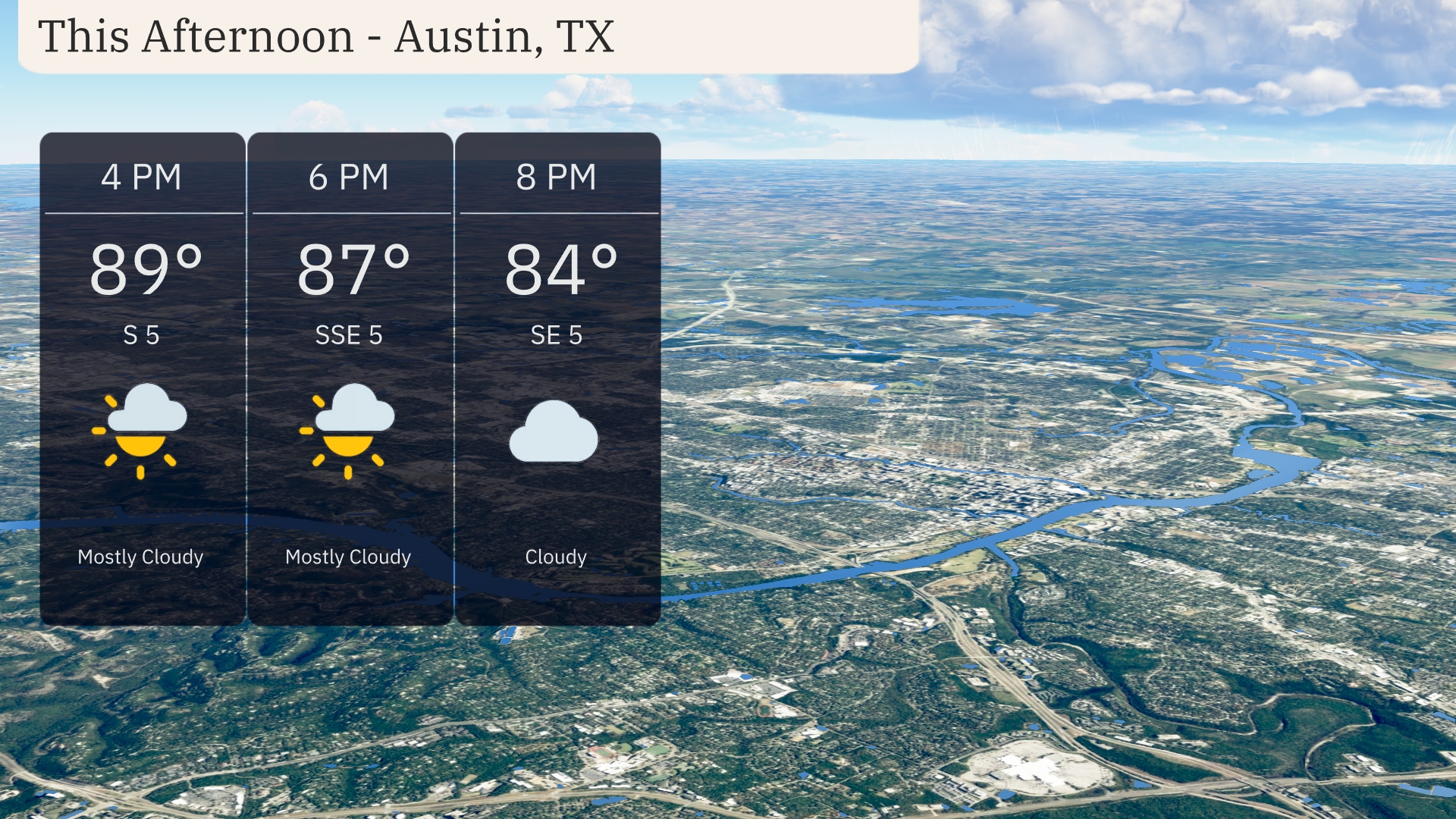 Afternoon temperatures in Austin are warming up to 89 degrees, accompanied by a gentle south wind at 5 miles per hour. Clouds will dominate, with mostly cloudy skies keeping the sun at bay. The temperature gradually eases to 87 degrees by 6 PM as winds shift slightly from the south-southeast at 5 miles per hour. By 8 PM, expect the temperature to drop to a cooler 84 degrees with cloudy skies continuing.