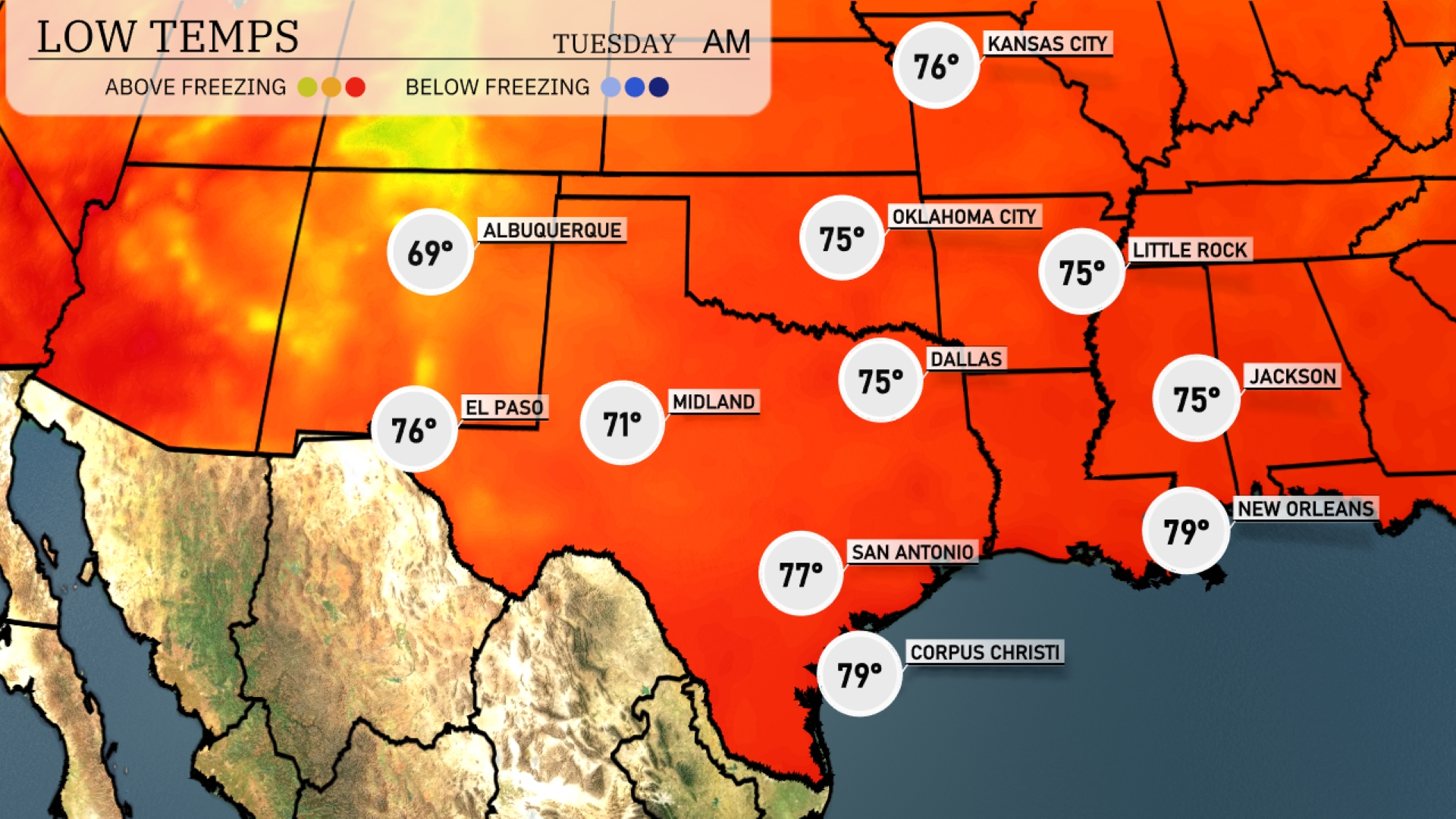 Tonight, Oklahoma City will see a low of 75 degrees, while Dallas is expected to drop to 75 as well. In Arkansas, Little Rock will have a low of 76 degrees, and further south in Texas, San Antonio is projected to stay warmer at 77 degrees. New Orleans rounds out the region with a low of 79 degrees, maintaining the milder temperatures across the Southern Plains.
