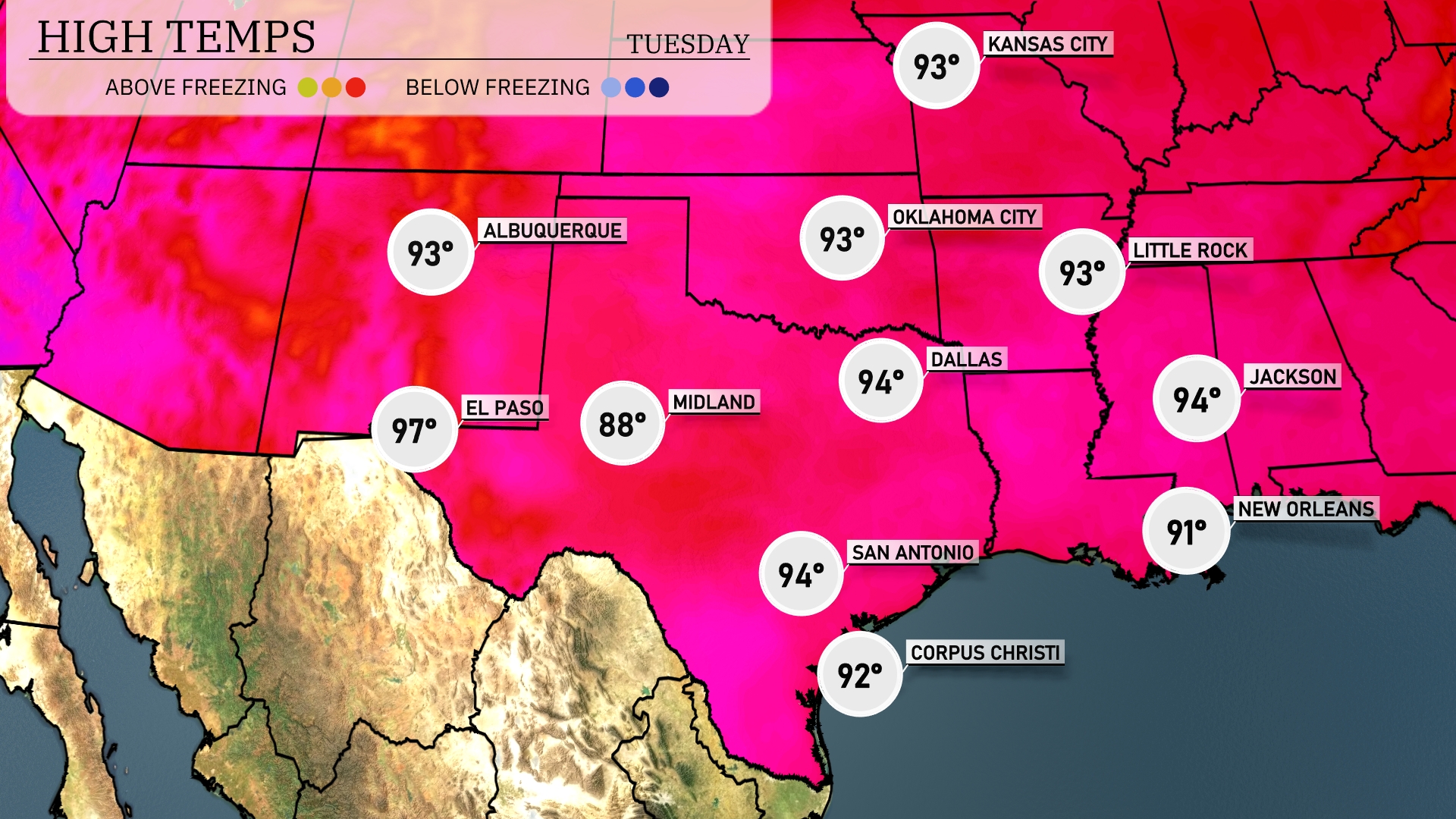 Tomorrow in the Southern Plains, El Paso will see a high of 97 degrees, while Midland climbs to 88 degrees. San Antonio is expected to reach 94 degrees, maintaining above-average temperatures for this time of year. In Dallas, the high will be slightly cooler at 94 degrees. New Orleans will also be warm, with an expected high of 91 degrees, indicating a broader trend of elevated temperatures across the region.