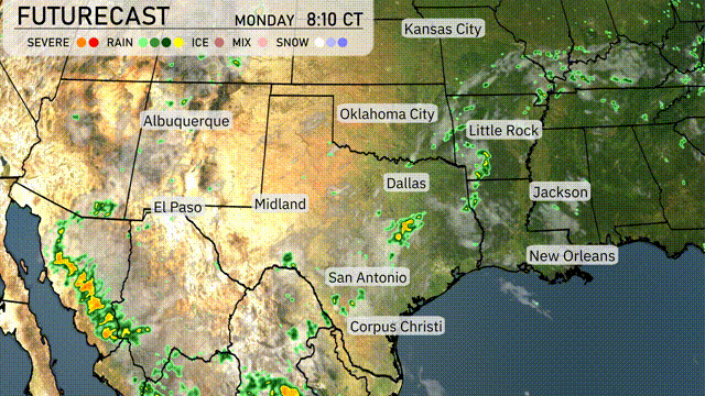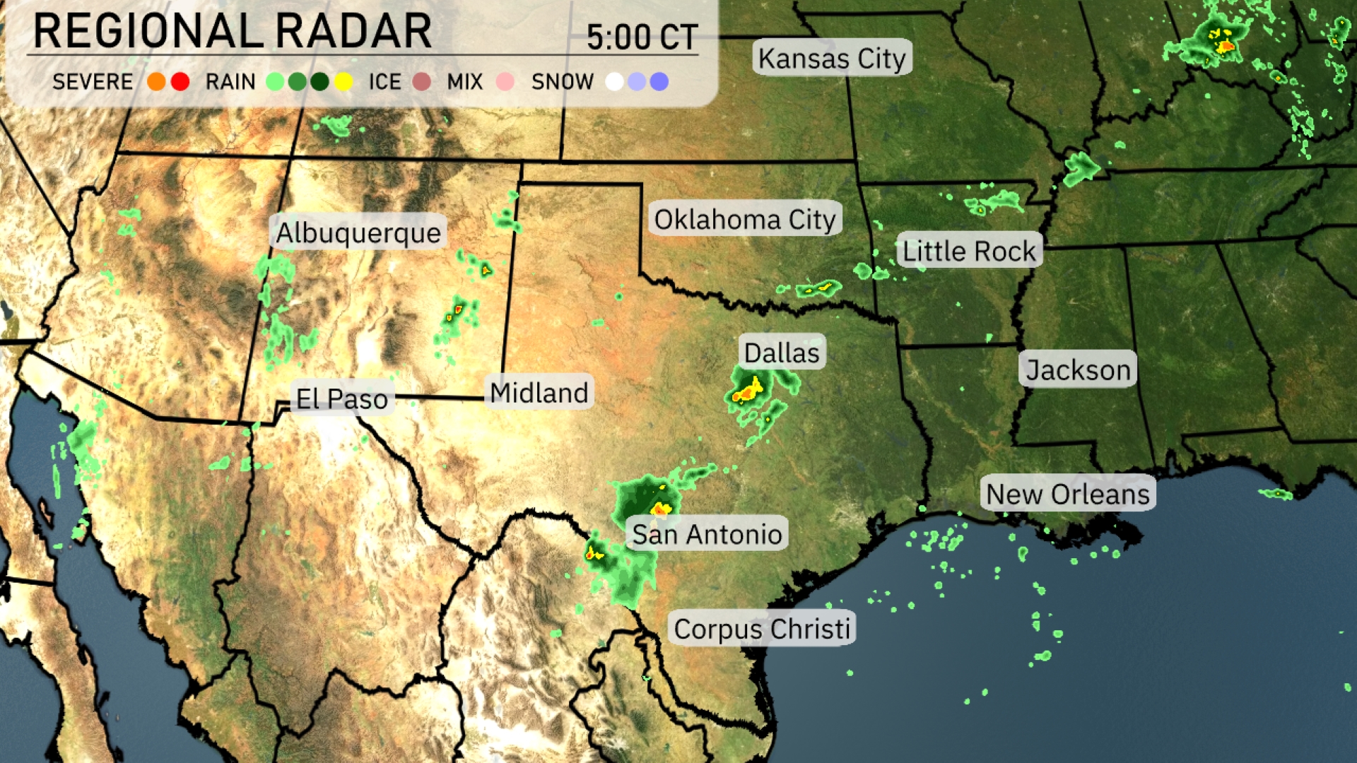 A line of storms is advancing northeast of Dallas, TX, bringing precipitation to the area with the potential for more severe weather as it moves. Showers are spotted in central Texas near San Antonio, slowly migrating toward Austin. Further west, El Paso is seeing some light rain showers, while most of the surrounding areas remain clear. Scattered showers are appearing near Albuquerque, with cloud cover extending toward central New Mexico.
