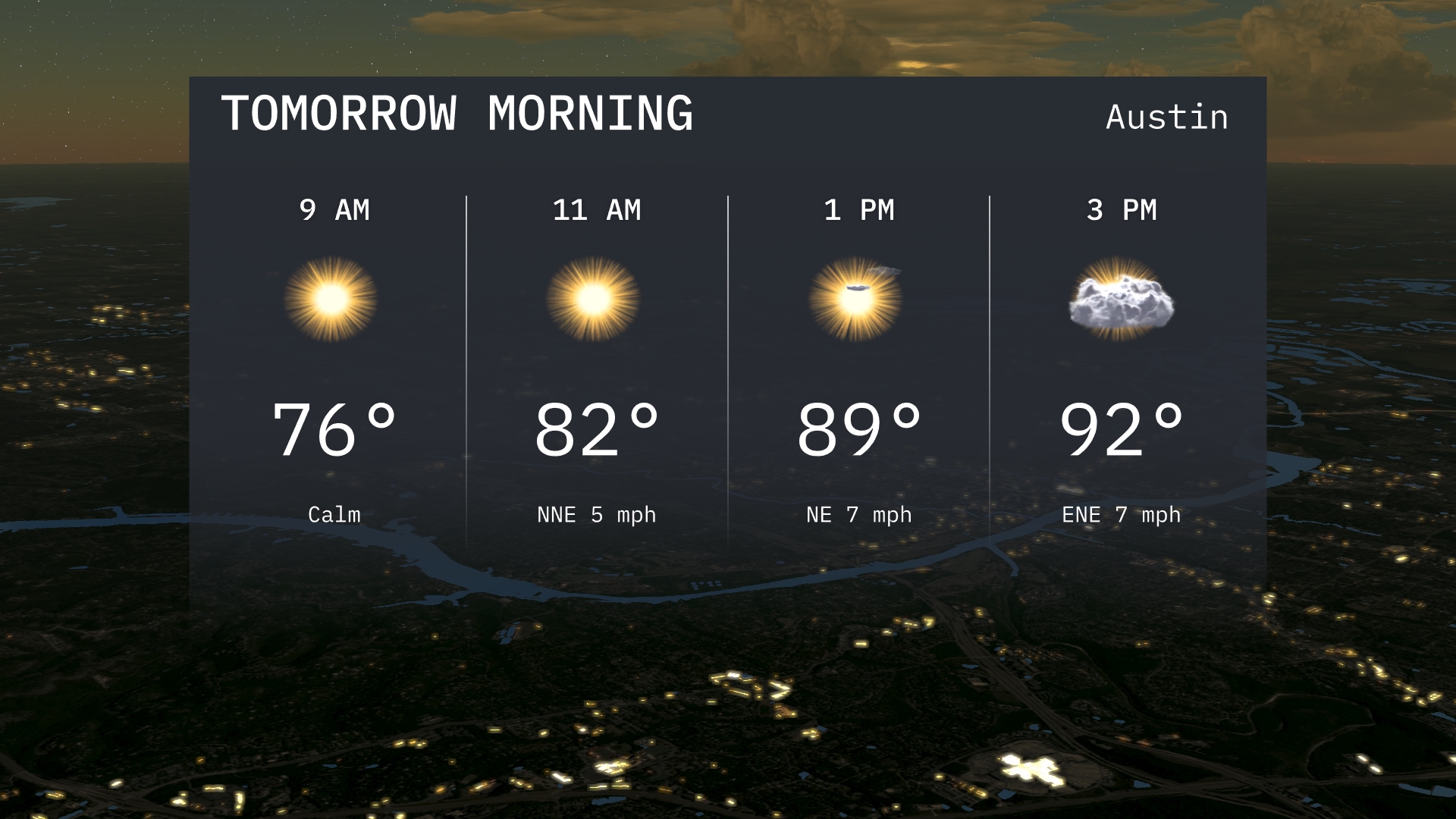 Tomorrow morning in Austin, start your day with clear skies and pleasant temperatures, beginning at 76 degrees at 9 AM. Expect a calm start to the morning, with light winds from the north-northeast by 11 AM. As you approach midday, temperatures rise to 82 degrees, with a continued gentle breeze from the northeast.