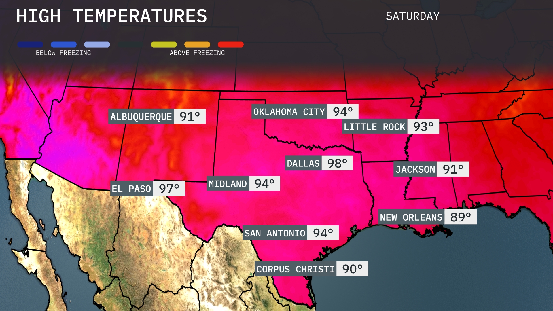 Tomorrow in Dallas, expect a high of 98 degrees, significantly above average for this time of year. El Paso is warming up as well, reaching 97 degrees. San Antonio will see highs at 94 degrees, while Midland also aligns with that at 94. Oklahoma City will reach 94, and Little Rock is expected to hit 93. Overall, the Southern Plains will experience a warm day, influenced by high pressure promoting these above-normal temperatures.
