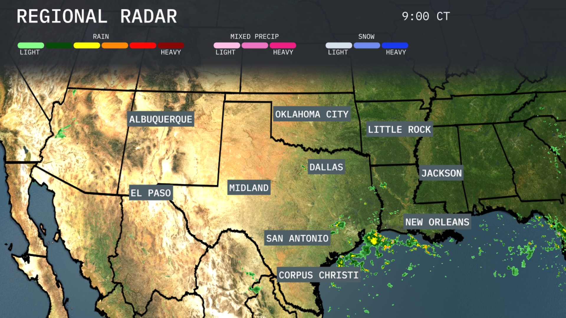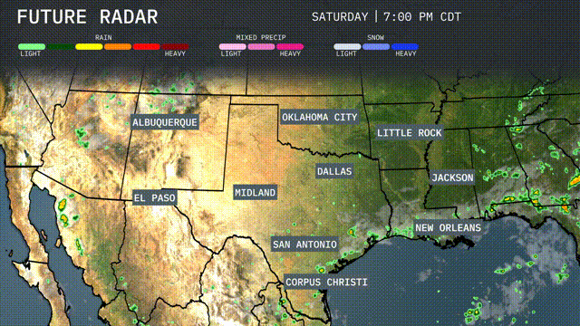Storms are developing in the southeastern part of the Southern Plains, with rain showers currently impacting areas near Corpus Christi and stretching along the Texas coastline toward New Orleans. Oklahoma City and Albuquerque are experiencing clear conditions, while some clouds are moving into the skies over El Paso. The rest of the region, including Dallas, Little Rock, and Midland, is mostly clear, providing a pleasant day for outdoor activities. Areas in far south Texas should remain alert for potential heavy rains later in the day as the system continues to drift eastward.