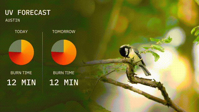 The UV index in Austin is a very high 9 today, with a quick burn time of 12 minutes. Tomorrow, expect the same very high UV index of 9 and a similar burn time. Cover up and use sun protection to keep skin safe!