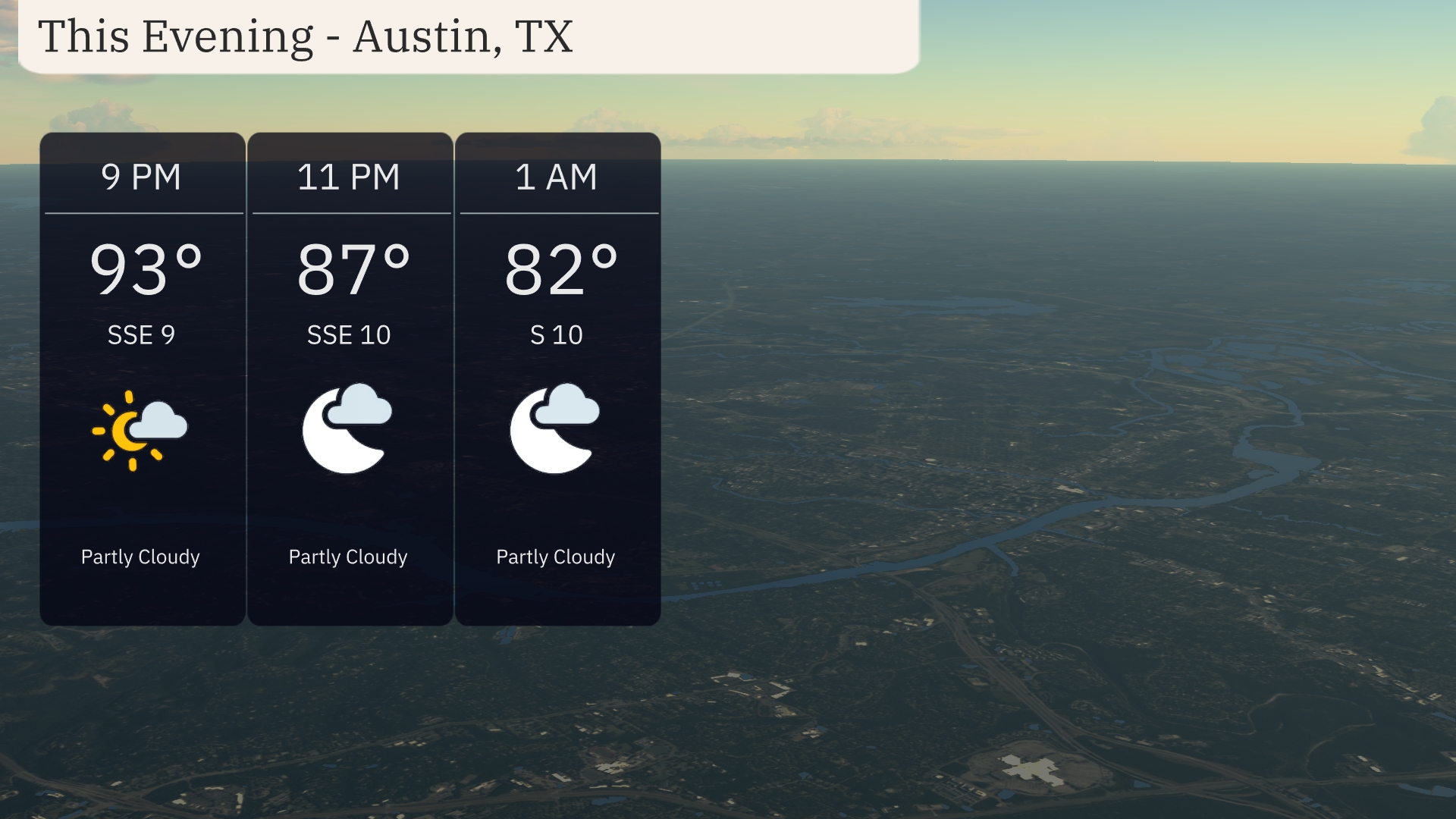 For this evening in Austin, temperatures will gradually dip from 93 degrees at 9 PM to 82 degrees by 1 AM. Expect partly cloudy skies throughout the evening with winds shifting from south-southeast at 9 mph to south at 10 mph.