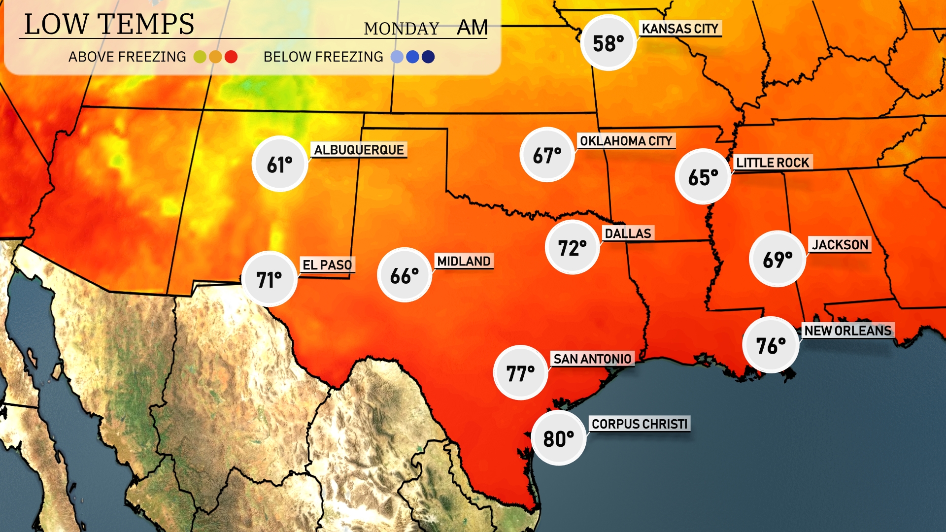 Tonight in the Southern Plains, Dallas will see a low of 72 degrees. Fort Worth is expected to drop to 69, while Little Rock will cool down to 65. Notably, Oklahoma City is forecasted to fall to 67 degrees. San Antonio remains mild with a low of 77, and down in Corpus Christi, expect a warmer night at 80 degrees.